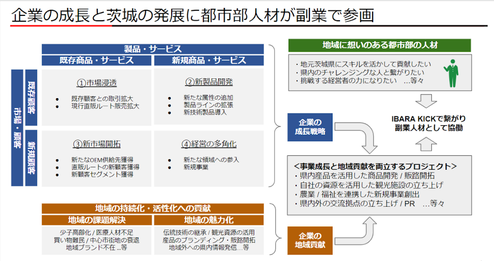 「iBARA KICK!(イバラキック)」は、企業の成長と地域課題解決の両立を目指す企業のプロジェクトに、主に都市部のスキルや経験を有する人材が副業として参加するプログラムです。