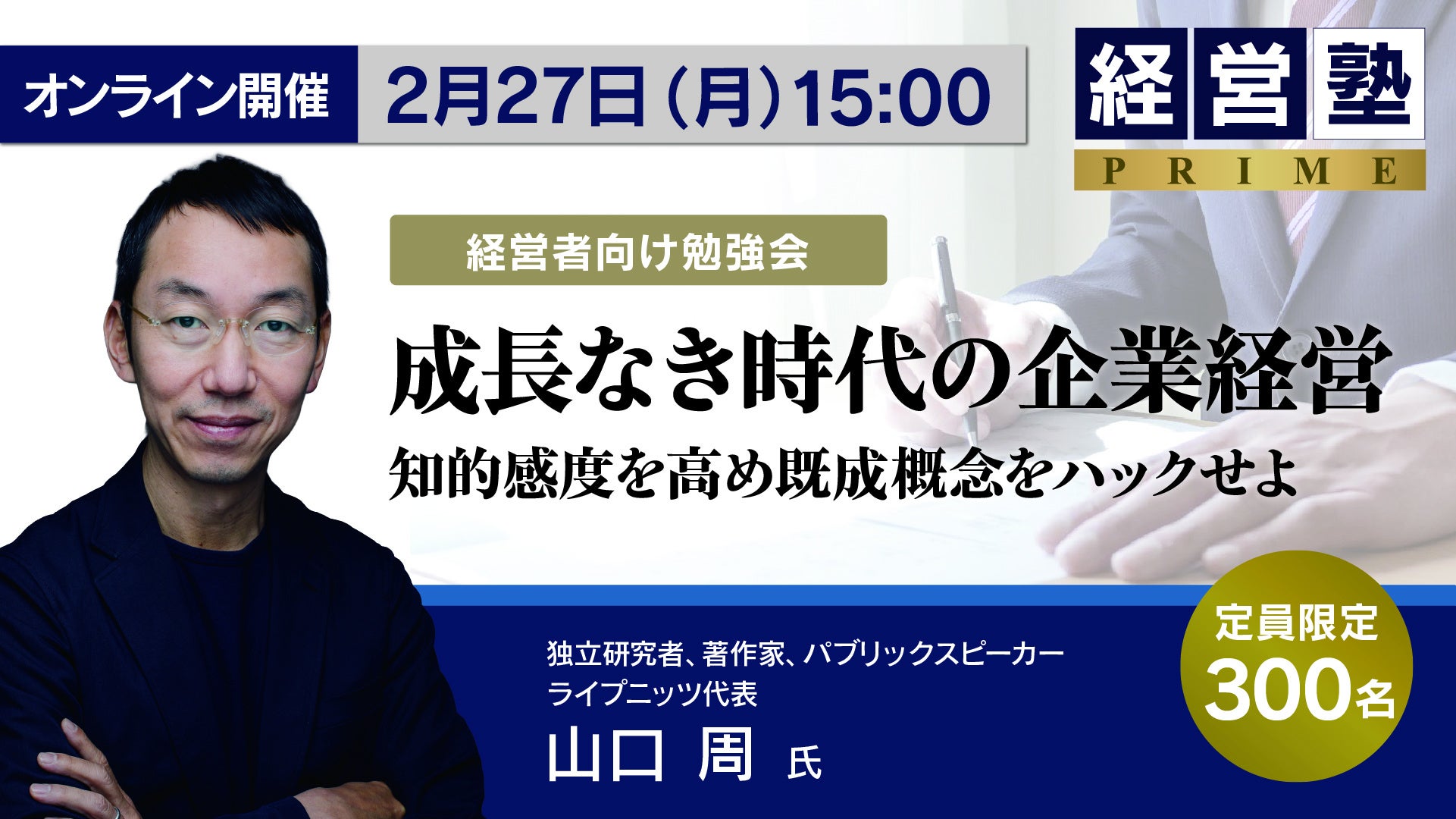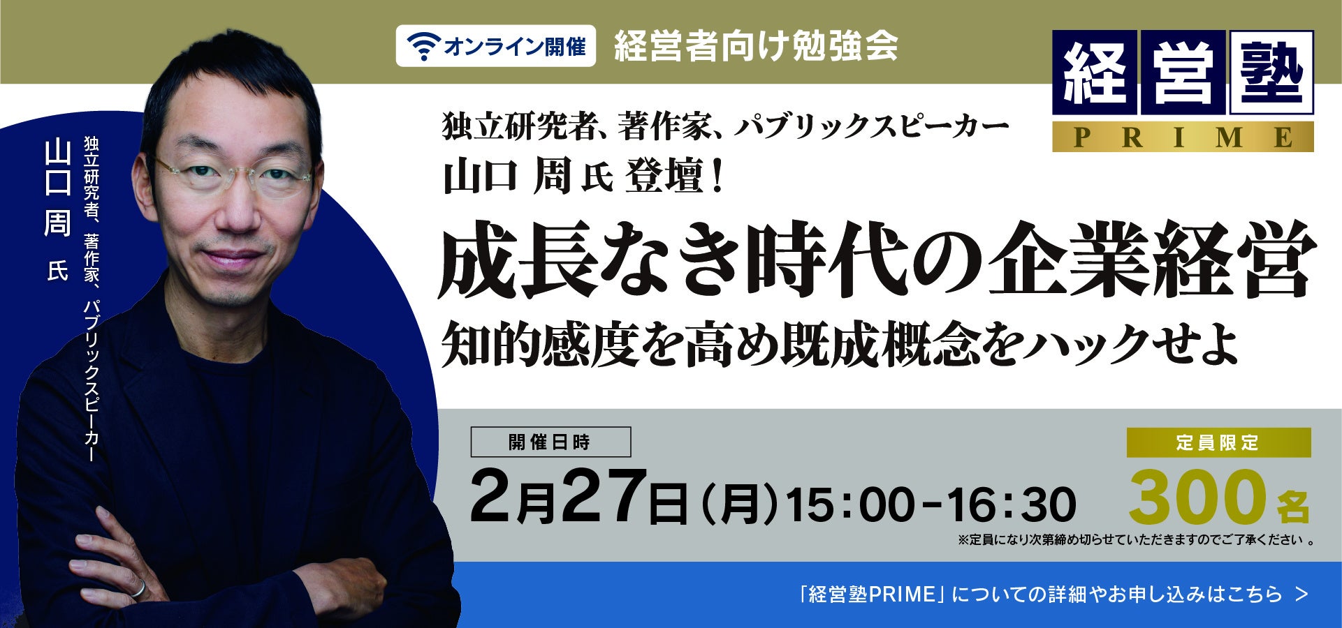 【無料オンラインセミナー】山口 周 氏 登壇!2023年2月27日(月)15時開催 経営者向け勉強会<経営塾PRIME>成長なき時代の企業経営~知的感度を高め既成概念をハックせよ