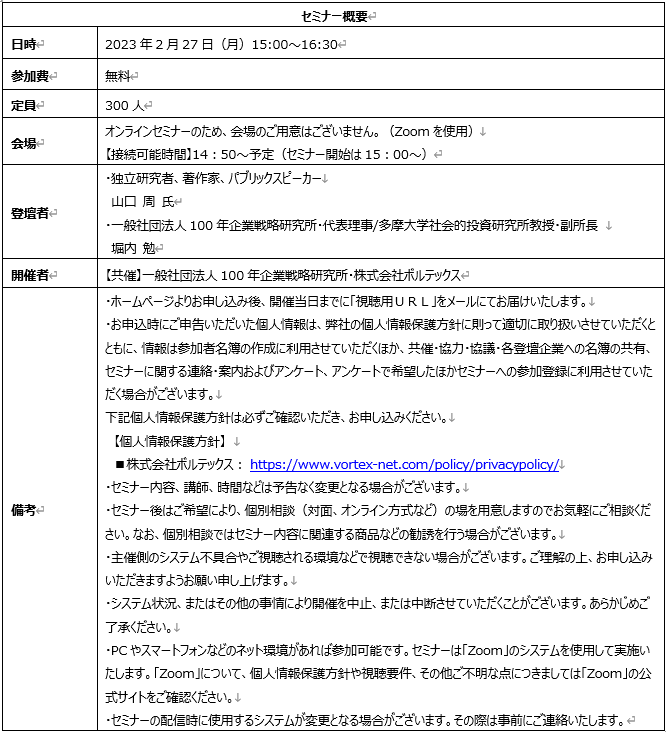 「区分所有オフィス®」を主軸に資産形成コンサルティングを行う株式会社ボルテックス(東京都千代田区 代表取締役社長 兼 CEO 宮沢 文彦、以下当社)は、一般社団法人100年企業戦略研究所(東京都千代田区 所長 堀内 勉)とオンラインセミナー「成長なき時代の企業経営~知的感度を高め既成概念をハックせよ」を共催しますのでご案内いたします。