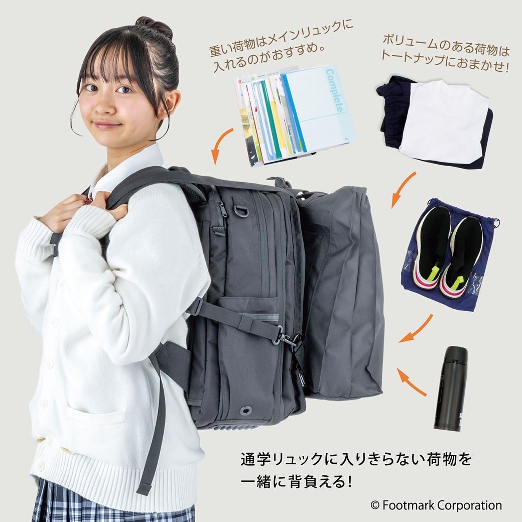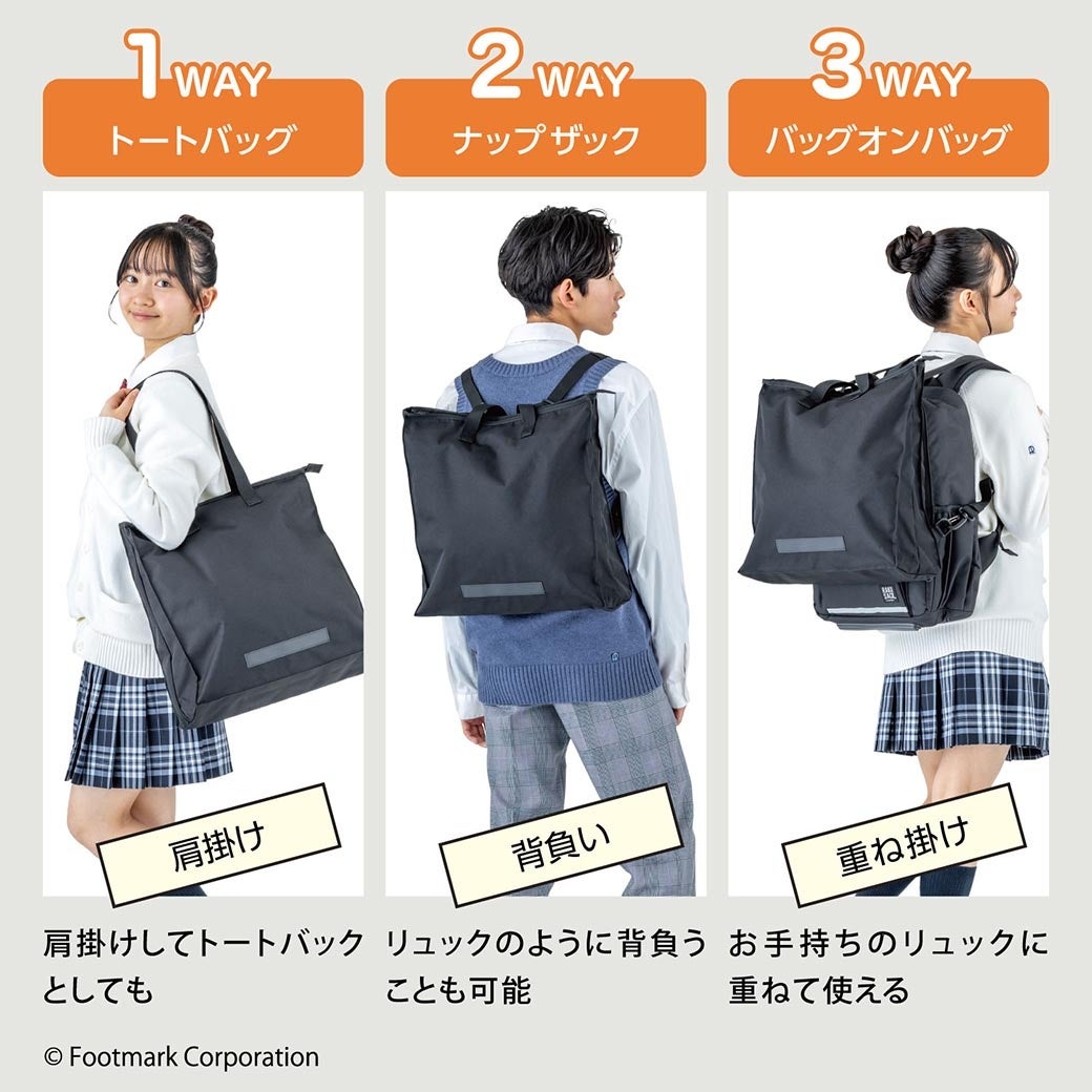 トートバッグ・ナップザック・バッグオンバッグの3通りの使い方ができることで、毎日の通学から部活動、移動教室、校外学習まで幅広いシーンに対応できる新しい形のサブバッグが誕生しました。