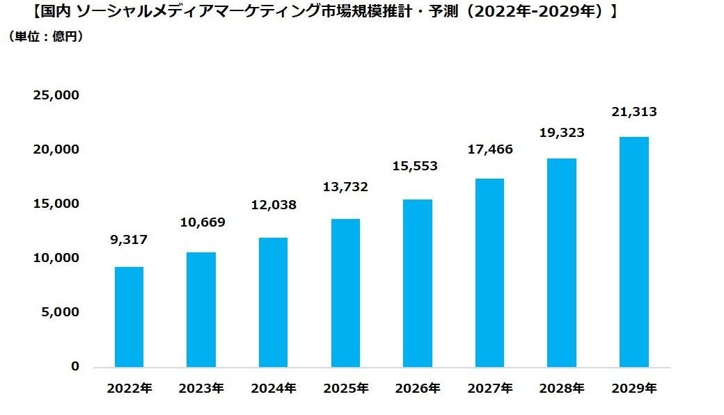 これらを背景に2029年のソーシャルメディアマーケティング市場規模は、2024年対比で177%、2兆1,313億円に達すると予測されます。