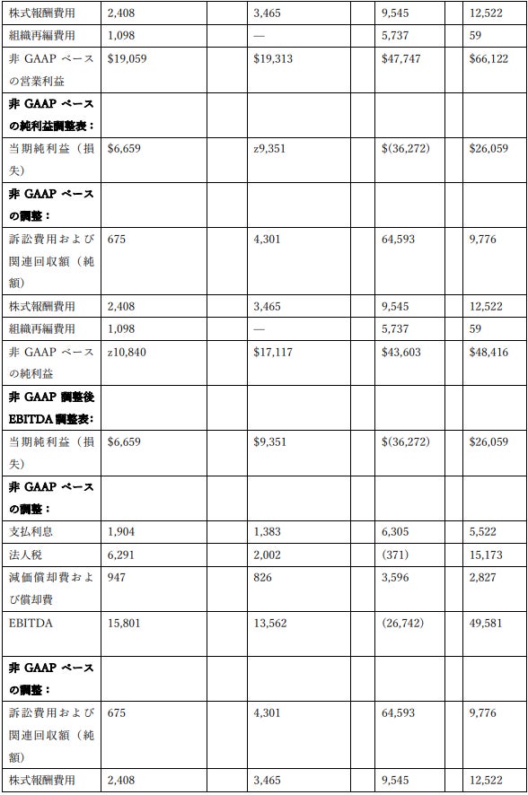 非GAAPベースの当期純利益は、訴訟費用および関連する回収金(純額)、株式報酬費用、組織再編費用を除外するために調整した当期純利益である。これらの除外項目の詳細については後述する。