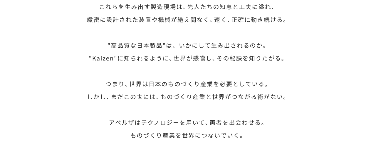 「ものづくり産業」の課題は、海外にも通用する技術力、品質が備わっているにもかかわらず、海外売上比率が低いことです。それは市場の大部分を中小企業が占めており、各企業が自助努力で海外進出を進めるには限界があるためです。そこでアペルザが考えたのが、日本全国に散らばる「ものづくり産業」と「グローバルマーケット(海外の工場)」をつなぐオンラインプラットフォームを構築し、海外展開の発射台の役割を担うということでした。