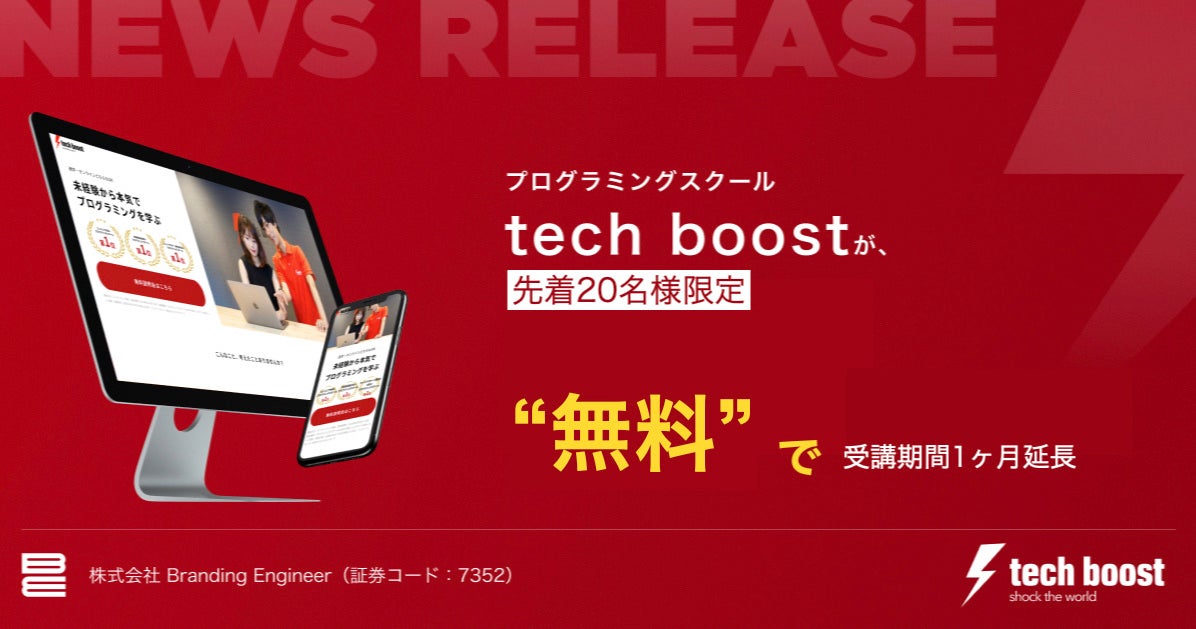 株式会社Branding Engineer(所在地:東京都渋谷区、代表取締役CEO:河端保志、代表取締役COO:髙原克弥、証券コード:7352、以下Branding Engineer)は、運営するプログラミングスクールtech boost(以下、tech boost)にて、無料カウンセリング当日にご契約していただいた方を対象に、無料で受講期間を1か月延長キャンペーンを実施することをお知らせいたします。