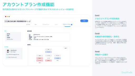 従来のアカウントプラン作成プロセスでは、ドキュメントツールを使用してアカウントプランを作成し、エクセルやパワーポイント、描画ツールを駆使して相関図を作成し、その後メンテナンスを継続する必要がありました。しかしこの手法では情報が点在し、作成・メンテナンスにかかる工数が増加していました。DealPodsでは、各社ごとに分けられた1つのページ内でアカウントプラン、相関図、アクションプランを簡単に作成できるため、情報を集約し、作成・メンテナンスの工数を削減することが可能です。