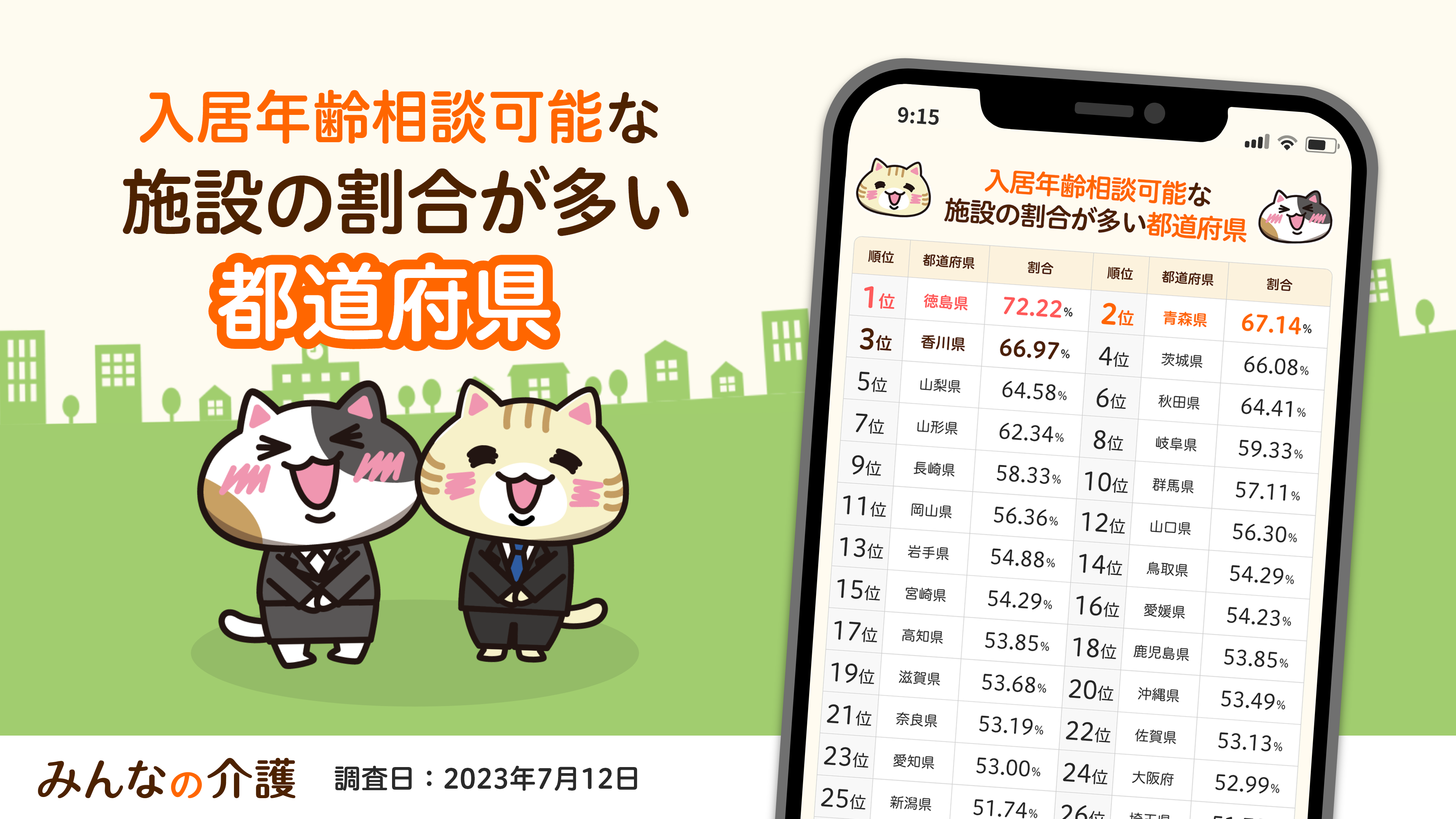介護施設検索サイト「みんなの介護」に掲載している老人ホームのうち、「入居年齢相談可」の項目に✓が入っている施設の割合を都道府県ごとに調査しました。
