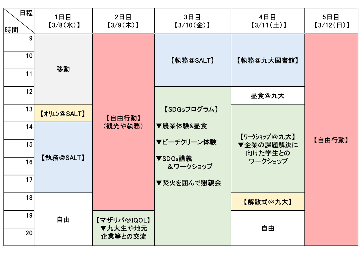 - 九大生メンバーがフィールドワークを行い、地域の魅力や企業ニーズを踏まえて開発した、 伊都キャンパスや唐泊ヴィレッジ等の施設を最大限活用したプログラム
