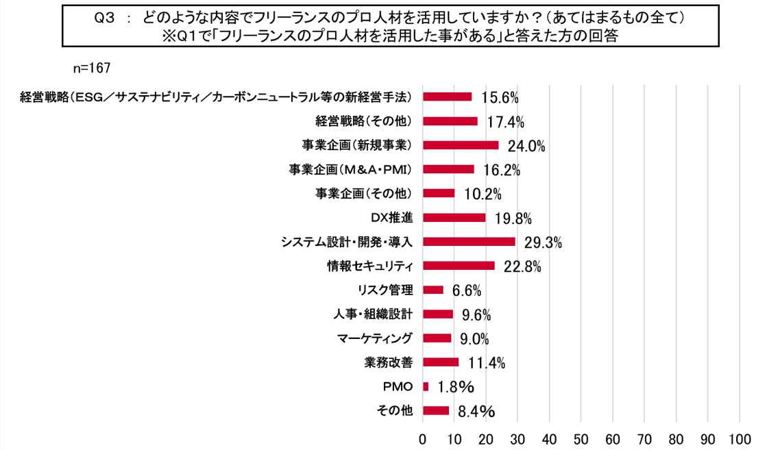 - 大企業でフリーランスのプロ人材を活用したことがある内容のトップ3は、 「システム設計・開発・導入」29.3%、「事業企画(新規事業)」24.0%、 「情報セキュリティ」22.8%であった。また、35.4%が「ESG/サスティナビリティ/カーボンニュートラル等の新経営手法」 、「DX推進」といった昨今、企業が早急に取り組みが必要とされている対応で活用していた。