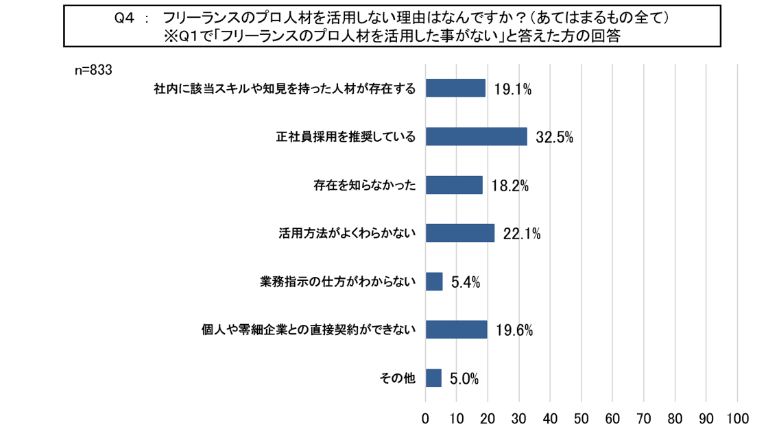 - 大企業でフリーランスのプロ人材を活用しない理由のトップ3は、「正社員採用を推奨している」32.5%、 「活用方法がよくわからない」22.1%、 「個人や零細企業との直接契約ができない」19.6%であった。