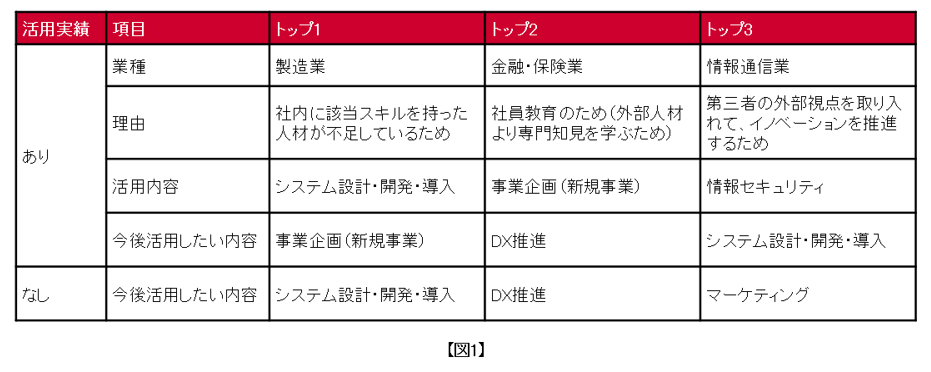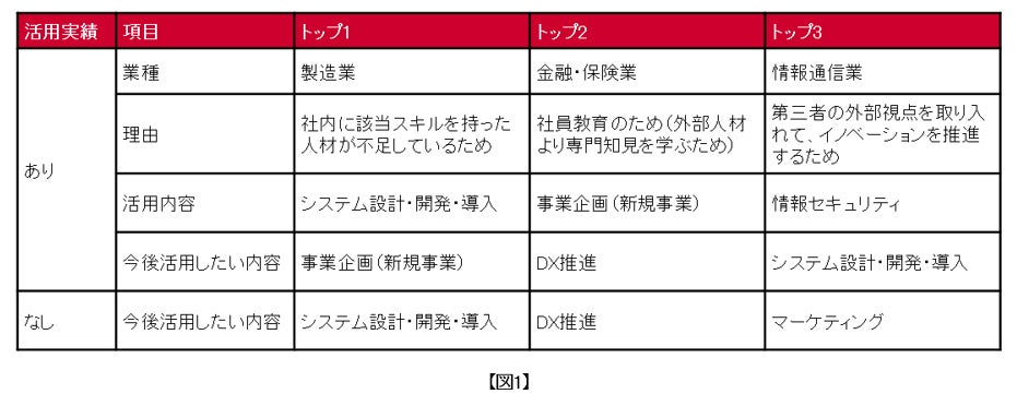 - フリーランスのプロ人材を活用した事がある大企業の業種、理由、活用内容、今後活用したい内容のトップ3は図1の通りであった。