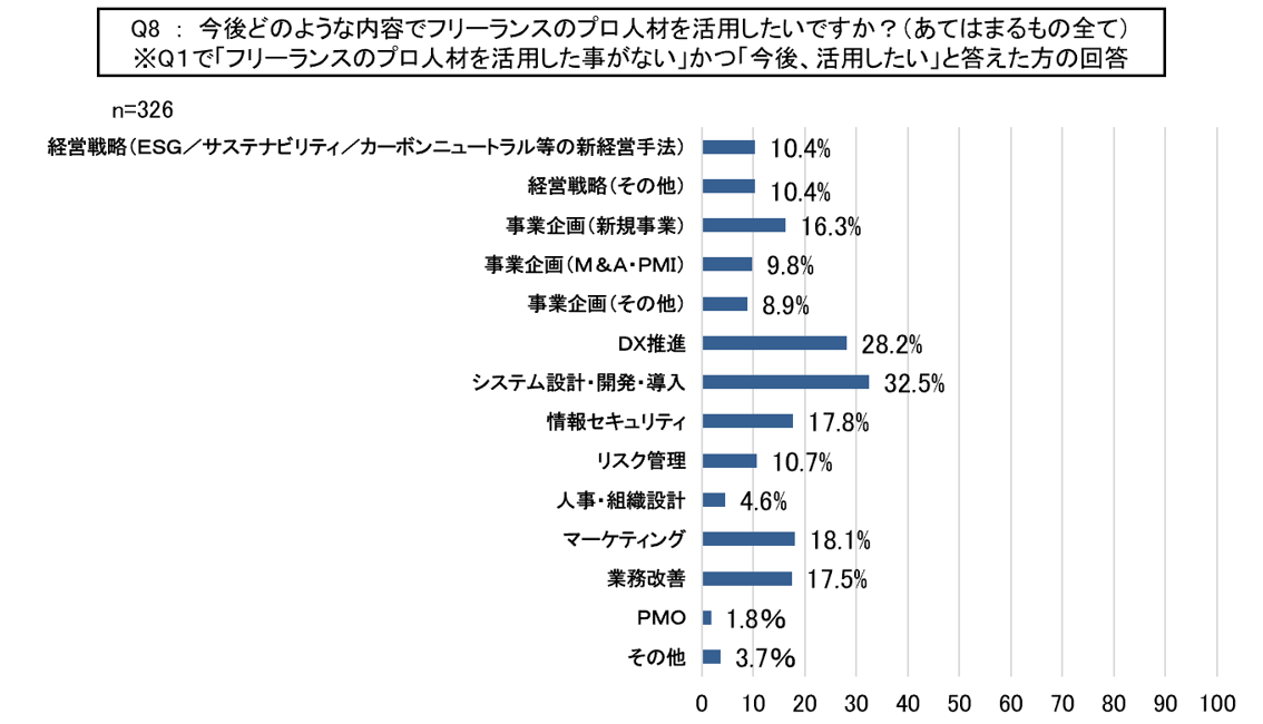 - フリーランスのプロ人材を活用した事がなく、今後活用したい大企業のうち39.2%が今後の活用を希望。活用したい内容のトップ3は、「システム設計・開発・導入」 32.5%、「DX推進」 28.2%、「マーケティング」 18.1%であった。その他、「内部監査」「品質管理」「営業企画」等で活用したいという意見もあった。
