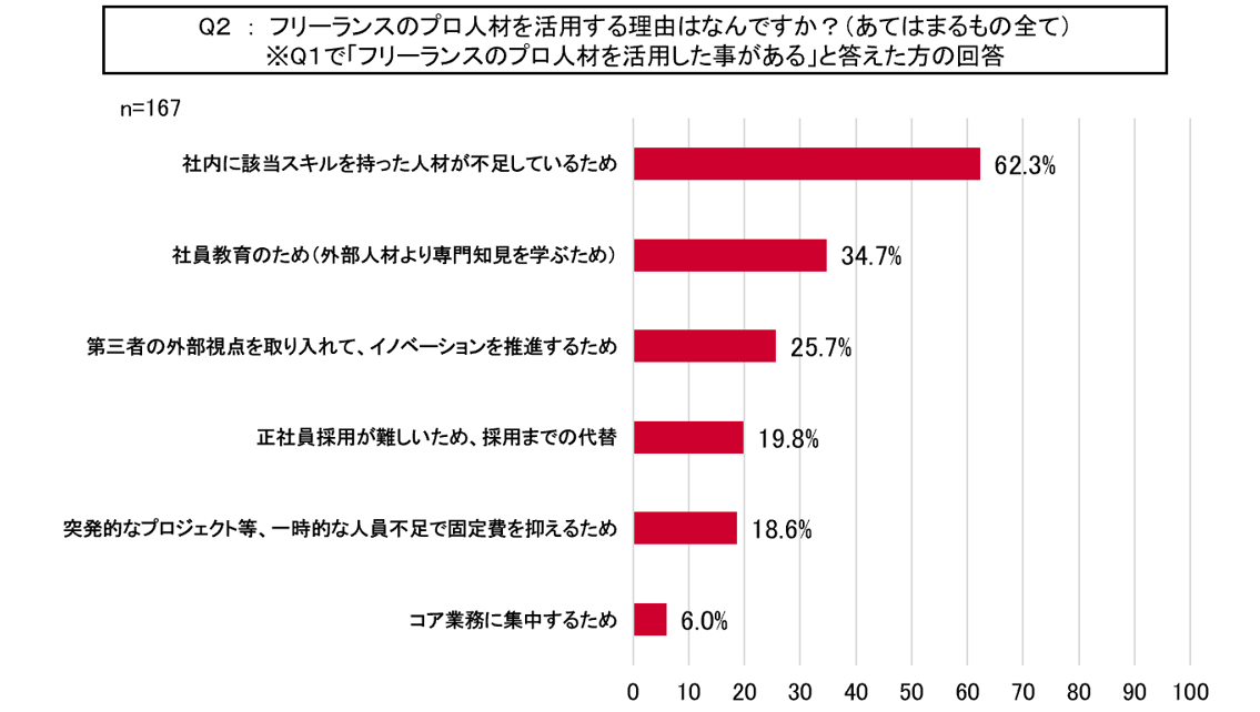 - 大企業でフリーランスのプロ人材を活用する理由のトップ3は、「社内に該当スキルや知見を持った人材が不足しているため」62.3%、「社員教育のため(外部人材より専門知見を学ぶため)」34.7%、「第三者の外部視点を取り入れて、イノベーションを推進するため」25.7%であった。