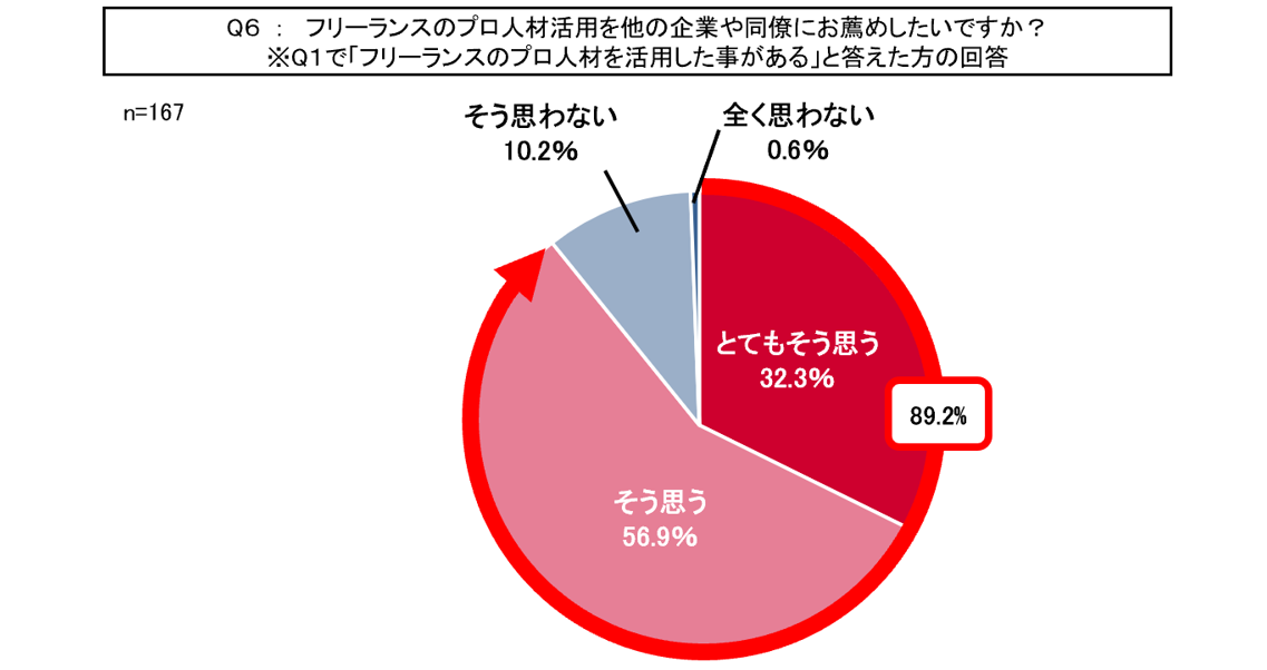 - フリーランスのプロ人材を活用した事がある大企業のうち89.2%が「他の企業や同僚にお薦めしたい」と回答。