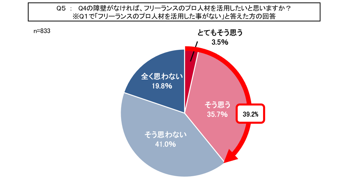- フリーランスのプロ人材を活用した事がない大企業のうち39.2%が「正社員採用を推奨している」「活用方法がよくわからない」等の障壁がなければ、「フリーランスのプロ人材を活用したい」と回答。