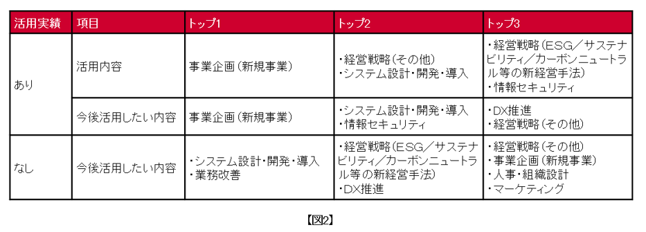 - 経営層・役員クラスの43.5%がフリーランスのプロ人材を活用していて、活用内容と今後活用したい内容のトップ3は図2の通りであった。