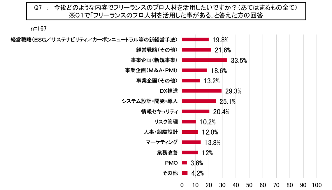 - フリーランスのプロ人材を活用した事がある大企業が今後活用したい内容のトップ3は、「事業企画(新規事業)」 33.5%、「DX推進」 29.3%、「システム設計・開発・導入」 25.1%といった内容での活用を希望。その他、「プロモーション」「教育」等で活用したいという意見もあった。