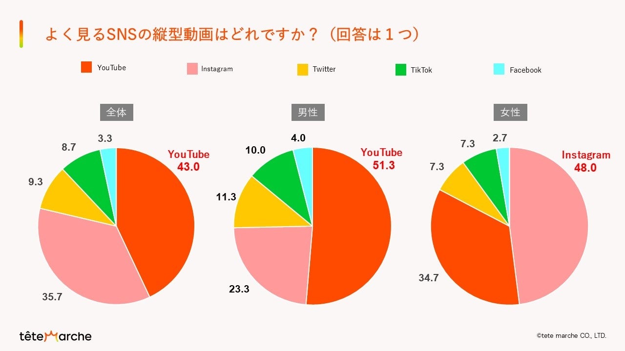 また、男女で縦型動画を視聴しているSNSに違いがみられ、男性の1位は【YouTube(shorts)】、女性の1位は【Instagram(Reels)】という結果になりました。