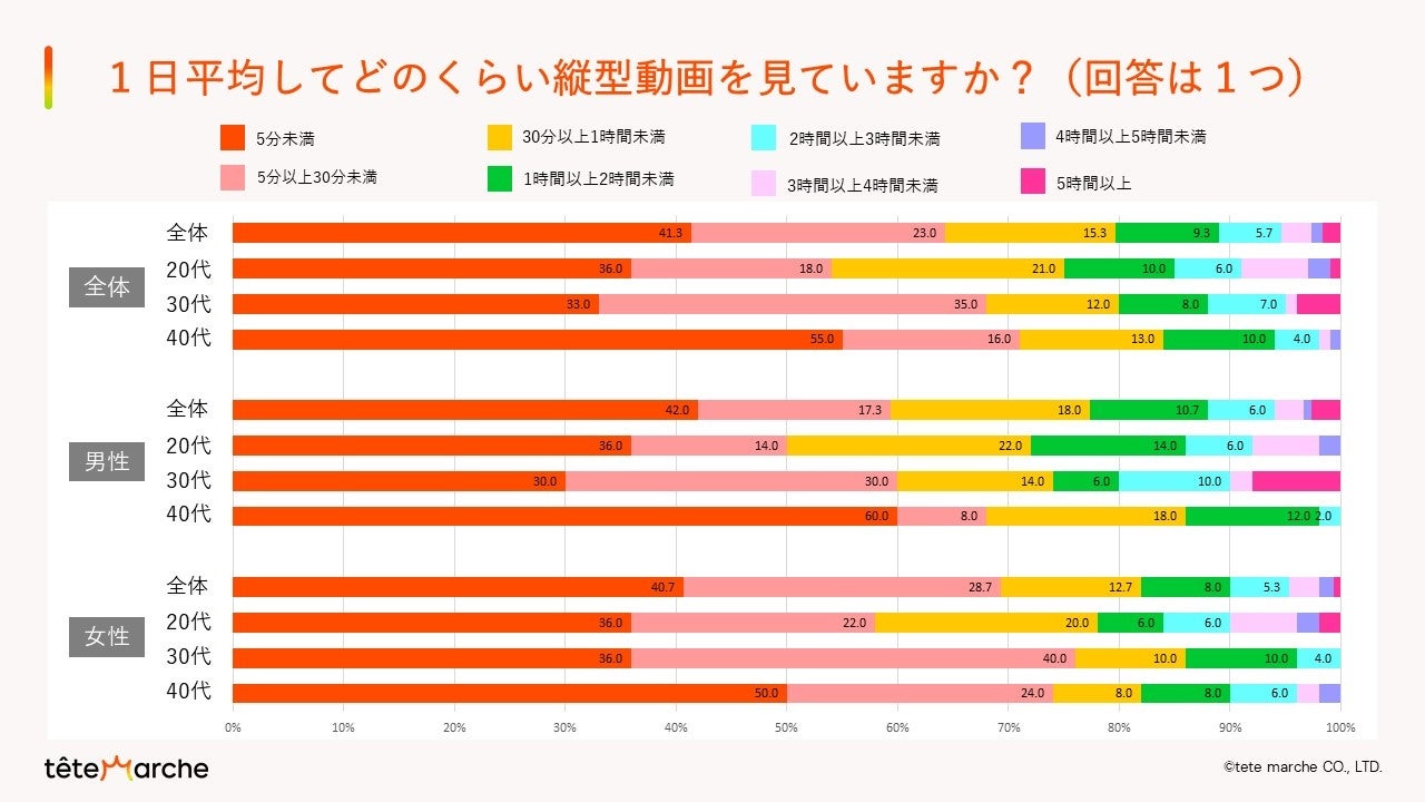 ・休日の縦型動画の平均視聴時間は、【5分未満】が41.3%で1位、【5分以上30分未満】が23.0%で2位、【30分以上1時間未満】が15.3%で3位でした。