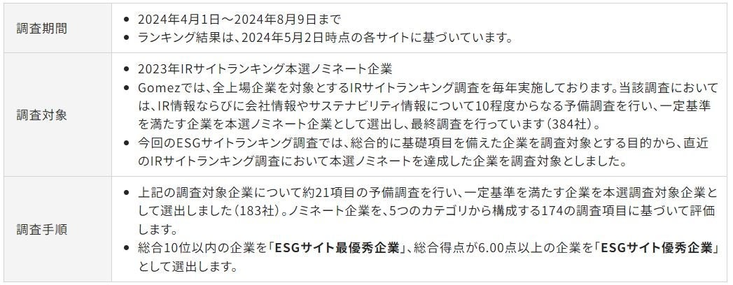 また、ノミネート企業183社のウェブサイトのうち、総合得点6.00点以上を獲得した169社については「ESGサイト優秀企業」に選定しました。総合ランキング結果及び「ESGサイト優秀企業」一覧は、Gomezのウェブサイト(https://www.gomez.co.jp/)をご覧ください。