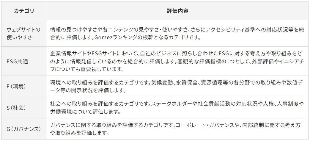 「Gomez ESGサイトランキング2024」における主要な評価項目やその達成状況は次の通りです。