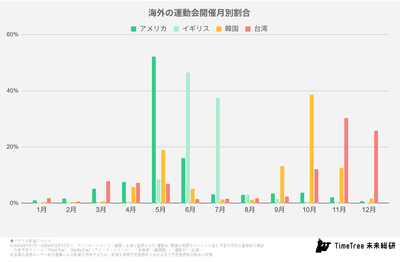 最後に、海外の運動会事情についても調べてみました。海外でTimeTreeユーザーが多い地域の内、「運動会」に近いイベントを開催する習慣があるアメリカ、イギリス、韓国、台湾において「運動会」の予定登録が多い時期を調査すると、アメリカでは5月、イギリスでは6~7月、韓国は10月、台湾は11月と12月と、海外では国や地域によって運動会の開催時期が大きく変わることがわかりました。