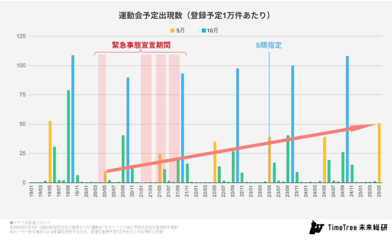 2022年には感染症対策の発令がなくなり、2023年5月には新型コロナウィルスが5類指定になったことで予定数は大きく回復し、2025年5月(5月18日時点)の登録予定1万件あたりの運動会予定出現数は、2020年の約5倍程度まで増加見込みとなっています。