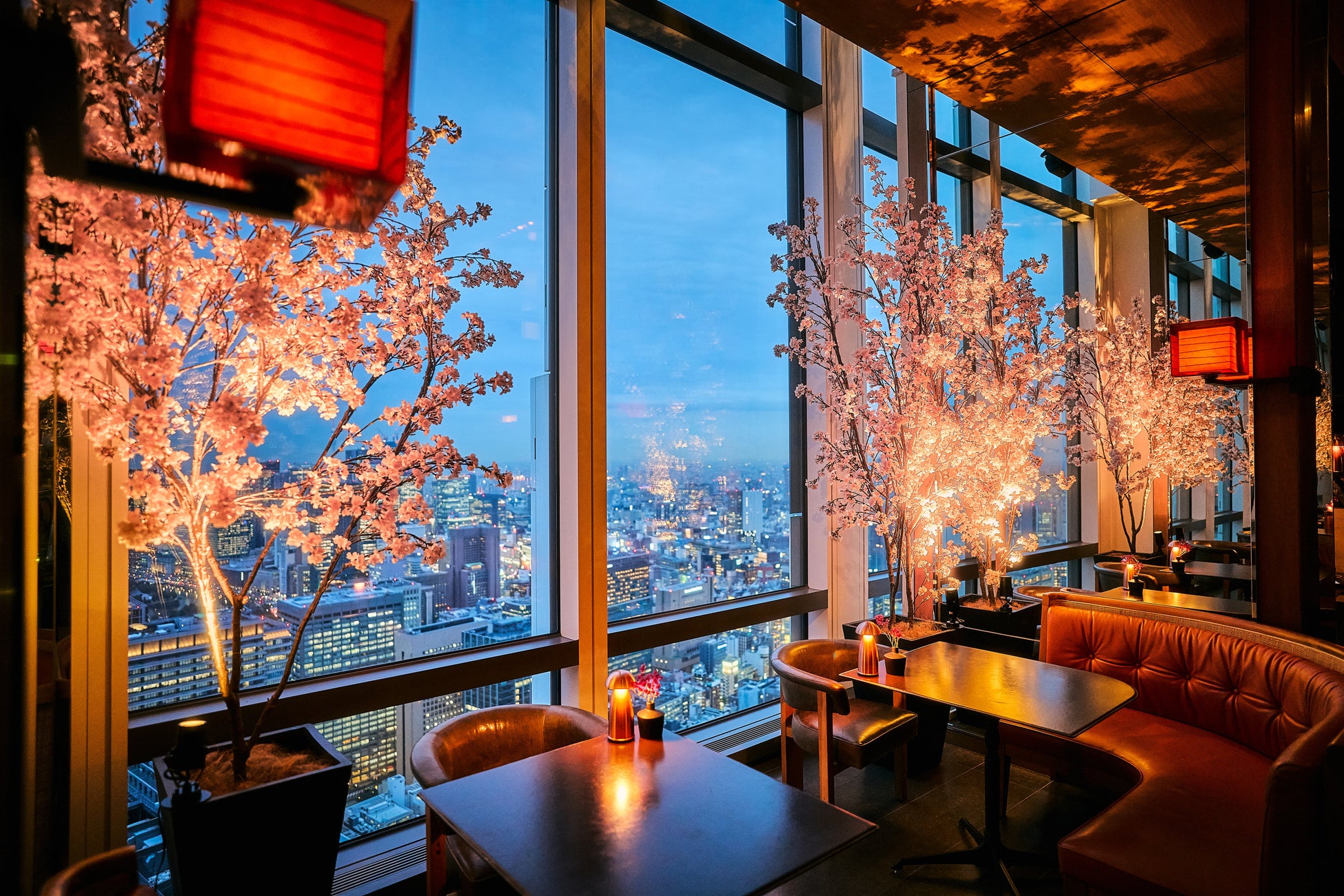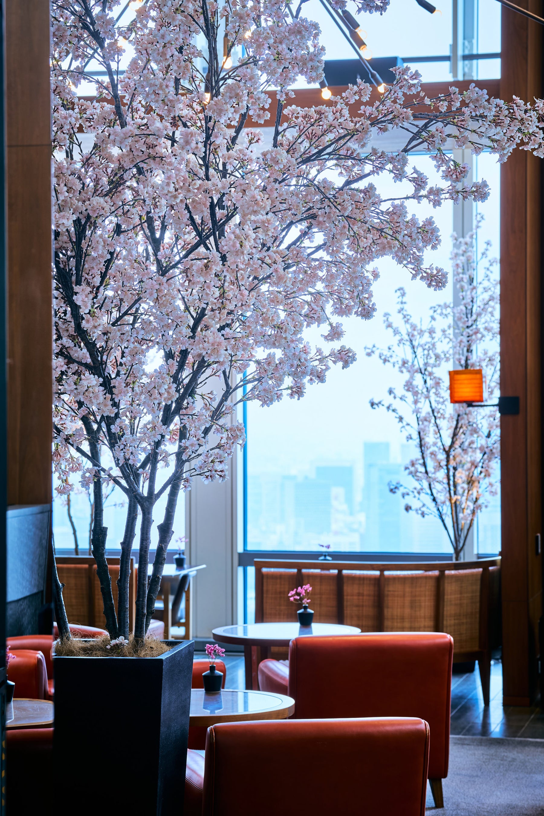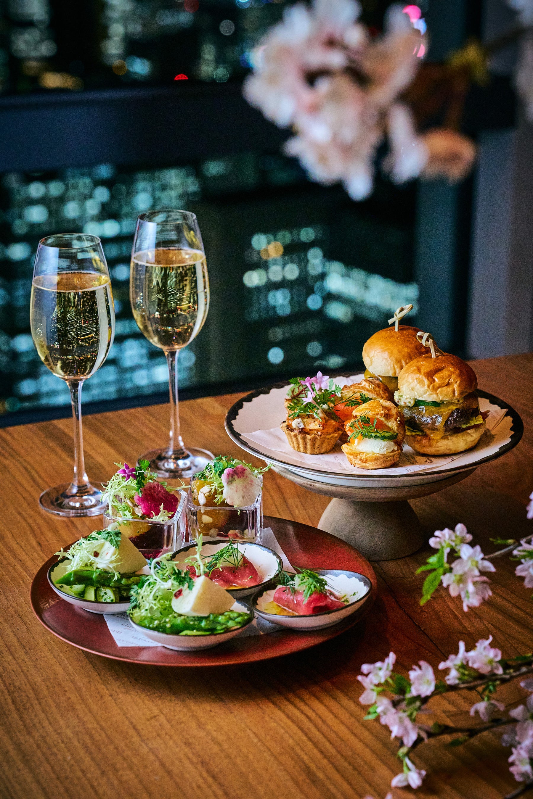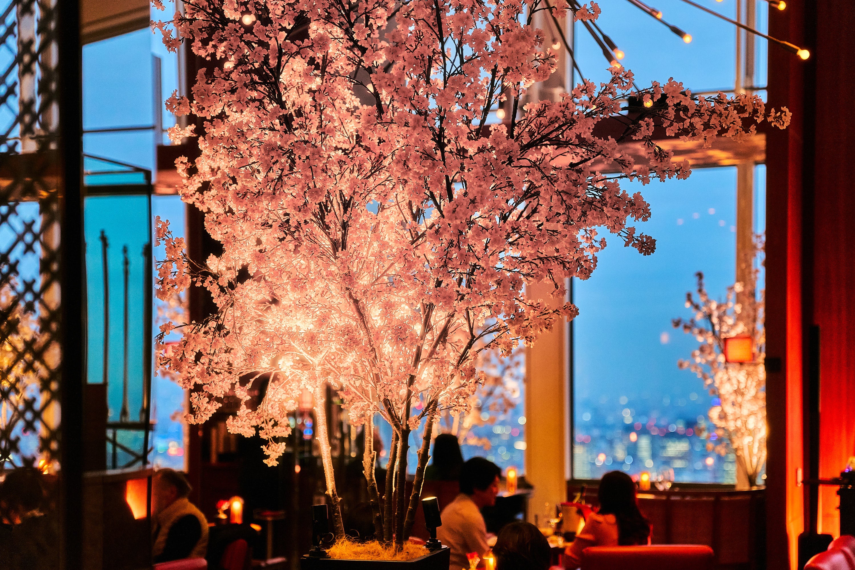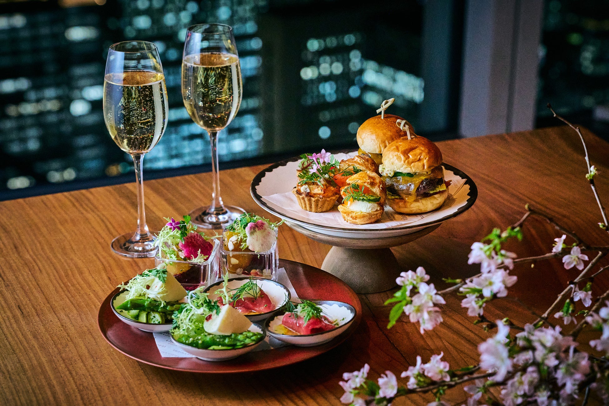 桜の装飾で彩られた店内にて、高層階からの景色とともに春の訪れを感じる華やかなペアリングをお楽しみください。