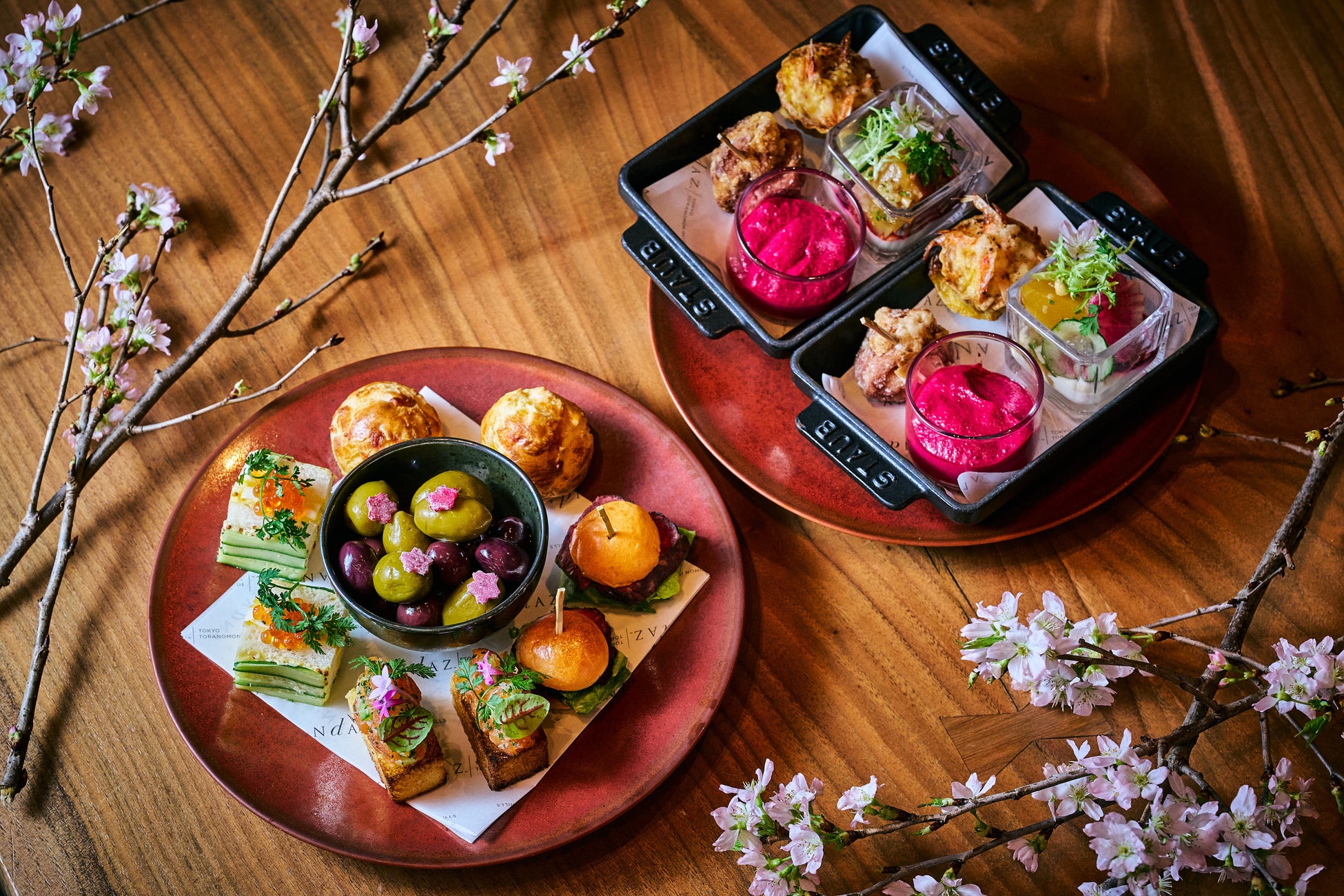 地上約250m、ルーフトップ バーの奥に広がる、東京タワーを間近に望む特別なテラス「トライアングルエリア」。今年もこの場所に、桜が咲き誇る空中庭園「桜ガーデン」が春の訪れとともに姿を現します。本物の桜を設置した、都心にいながらも混雑とは無縁の落ち着いた空間にて、1日18組限定の「夜桜プレミアムビュープラン」をご用意。ペリエ ジュエのシャンパーニュをはじめとする美酒とともに、シェフが手掛ける特別なメニューを煌めく夜景と夜桜に包まれながらお楽しみいただけます。カナッペには、桜海老とグリュイエールチーズの香ばしさが広がる「桜海老のキッシュ」や、厳選した富士山サーモンを自家製スモークにし、爽やかなヨーグルトソースと胡瓜・玉葱ピクルスの食感を重ねた「スモーク富士山サーモンタルタル」など、春の情景を映し出す彩り豊かなメニューが揃います。夜景、夜桜、美酒、美食が織りなす、この季節だけの特別な舞台で、五感を満たす贅沢なお花見をご堪能ください。