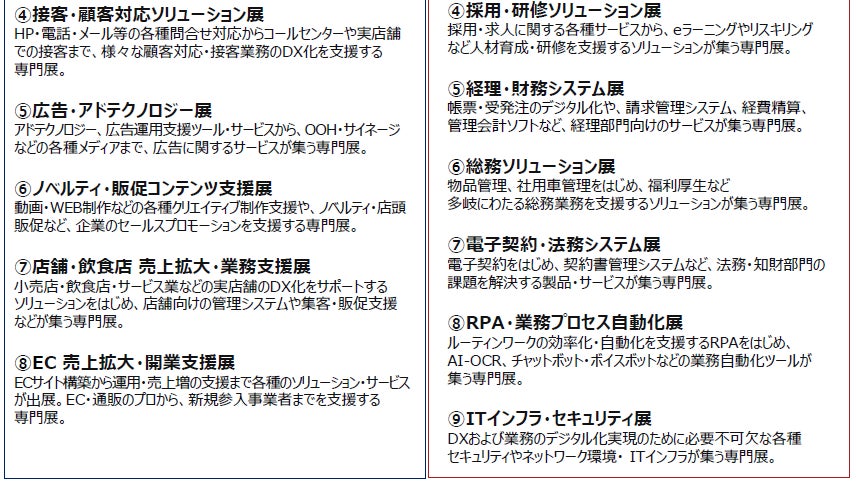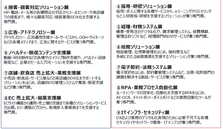 来場対象者は、DX推進に課題を持つ経営層に加え、営業、マーケティング、Web担当、集客・販促・PR担当、小売店、飲食店、EC担当の方々である。