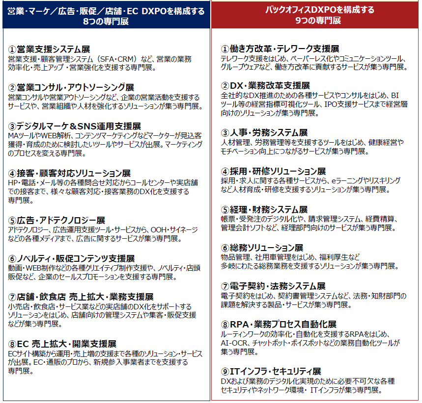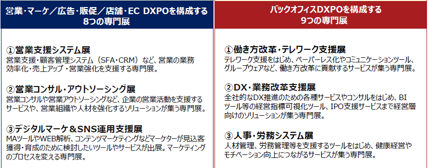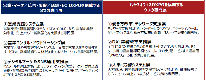 後半2日間[2024年2月29日(木)・3月1日(金)]開催の、『第2回 バックオフィスDXPO大阪’24』は、製品ジャンル毎に、9つの展示会で構成され、総務・人事・経理・法務など管理部門の業務効率化・DX推進を支援する注目のIT製品が一堂に出揃う。