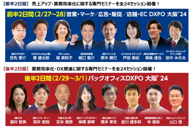 営業・マーケ/広告・販促/店舗・EC DXPO 大阪'24では、"その場で契約させる"独自のメソッドを営業マンに伝授する (株)即決営業 堀口龍介氏、数多くの企業の広報・PRを手掛けてきたマーケティングの専門家(株)ファンくる黒木勝巳氏が登壇。