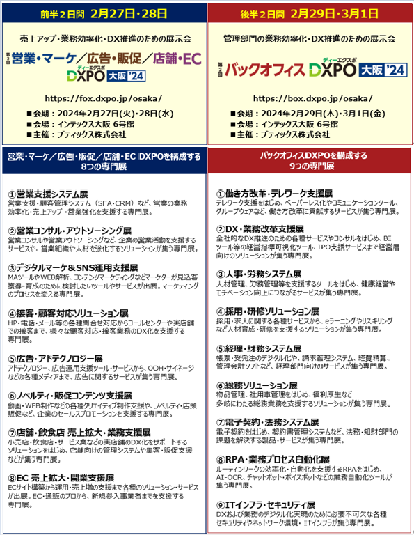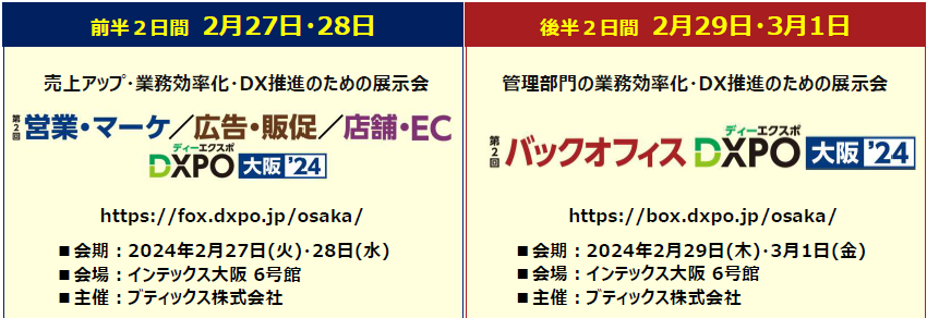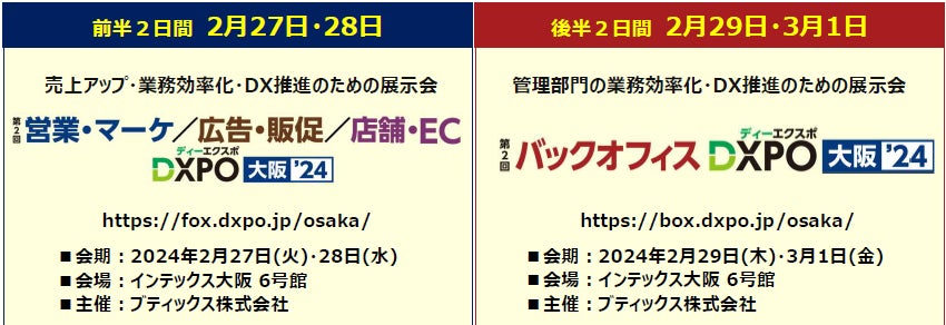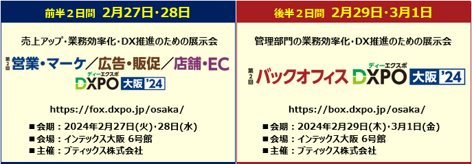 展示会事業、M&A仲介事業などを展開する、ブティックス株式会社(東京都港区、代表取締役社長 新村祐三、東証グロース上場 証券コード:9272)は、企業の業務効率化・売上アップ・DX推進をテーマとした以下の2つの展示会を、インテックス大阪にて連続開催する。