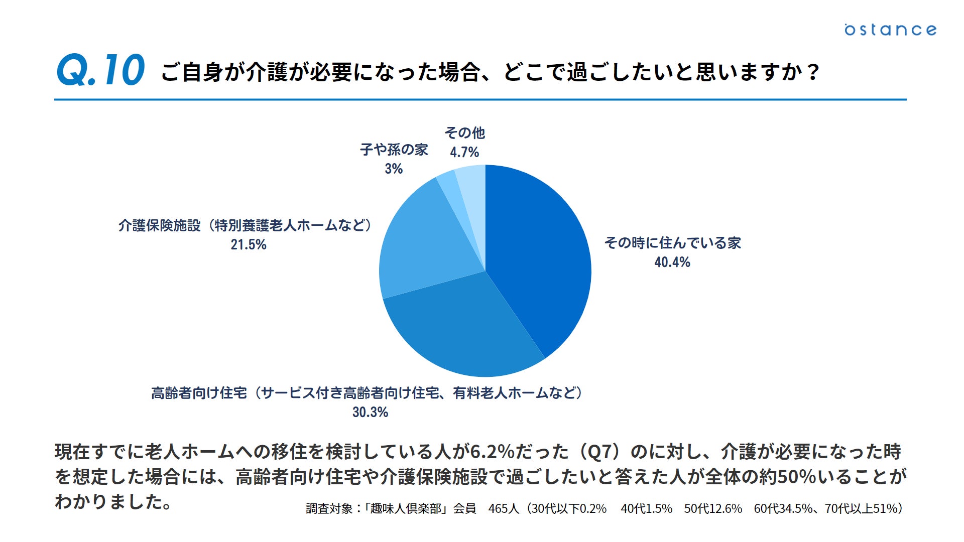 Q7「老後のお住まいについて、どのような形態をとっていますか。もしくはとりたいと思っていますか。」という質問の中で、現在すでに老人ホームへの移住を検討しているシニアが6.2%だったのに対し、介護が必要になった時を想定した場合、全体の約50%が高齢者向け住宅や介護保険施設で過ごしたいと回答しました。