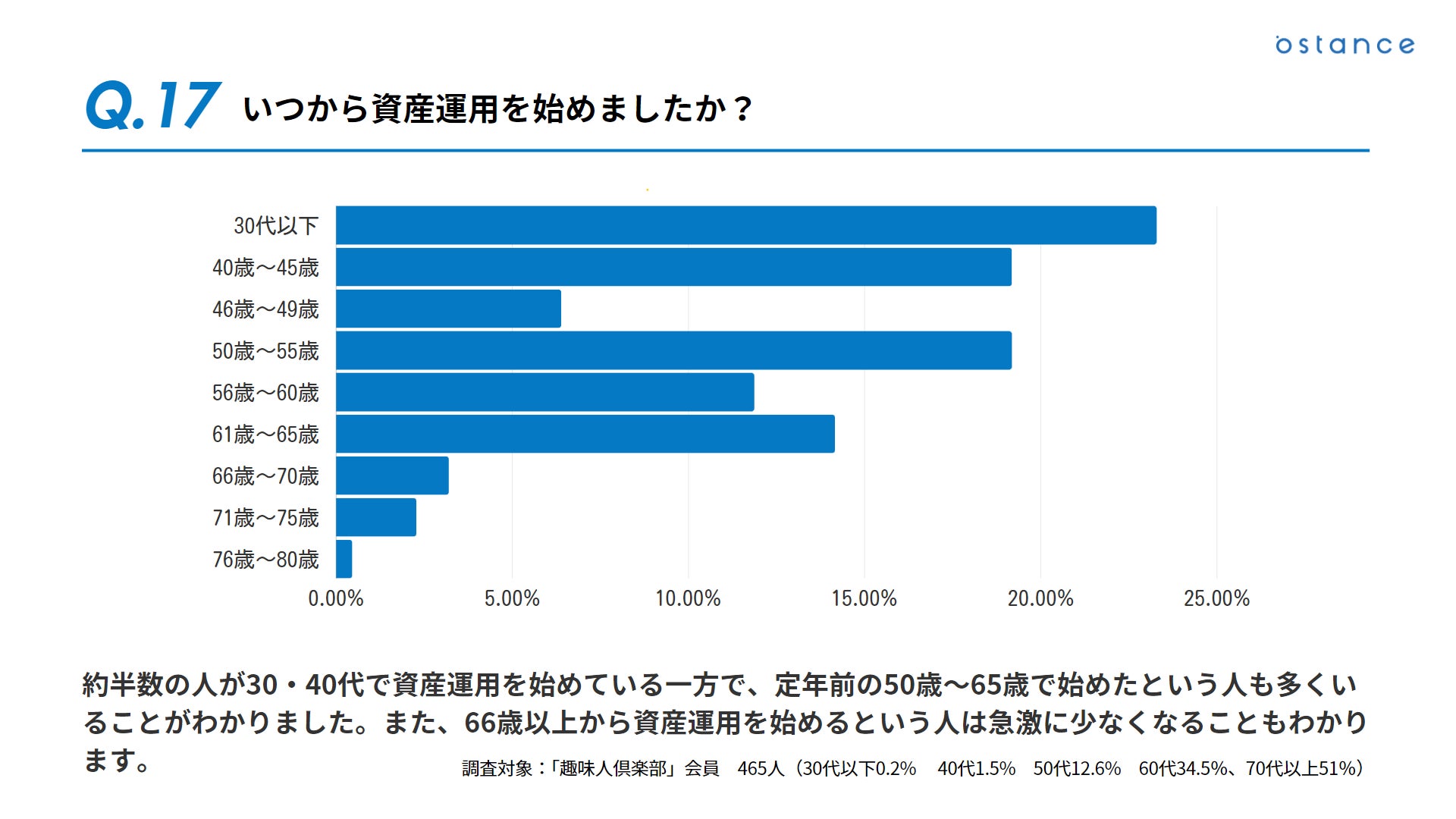 約半数の方が30・40代で資産運用を始めている一方で、定年前の50歳~65歳で始めたというシニアも多くいることがわかりました。また、70代で資産運用を始めるという方は全体の約3%と急激に少なくなることもわかります。