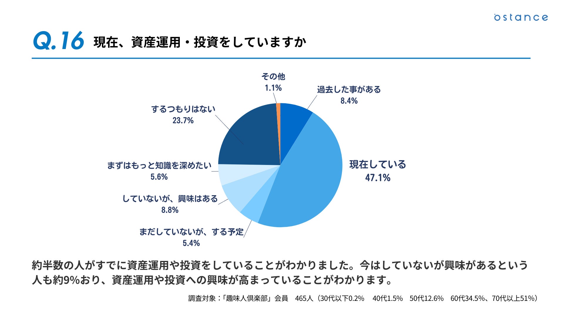 約半数のシニアがすでに資産運用や投資をしていることがわかりました。