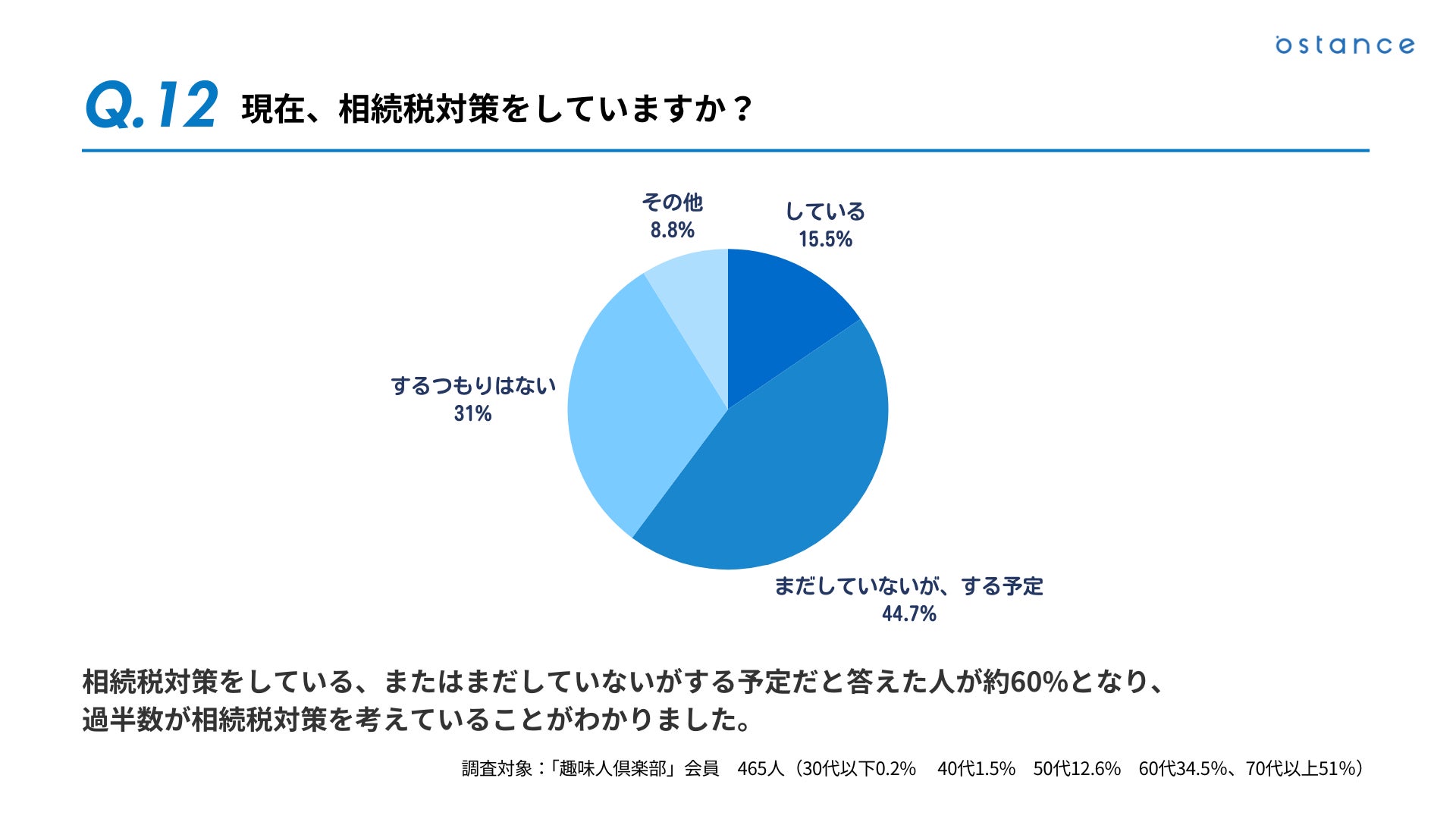 相続税対策をしている、またはまだしていないがする予定だと答えた方が約60%となり、過半数が相続税対策を考えていることがわかりました。