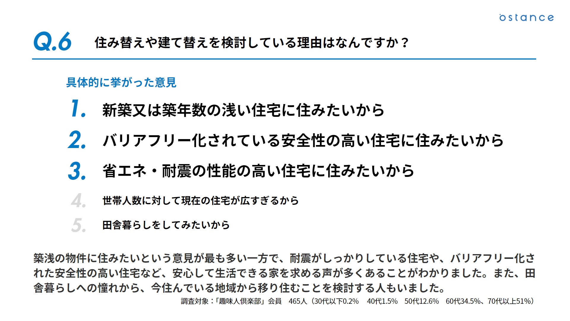 築浅の家に住みたいという意見が最も多い一方で、安心して生活できる家に住み替え・建て替えたいという意見が多くありました。住み替えや建て替えを考える理由として、耐震機能の高い住居に住みたい・バリアフリー化されている住居に住みたいという人が多い中、田舎へ転居したいという意見も見られました。
