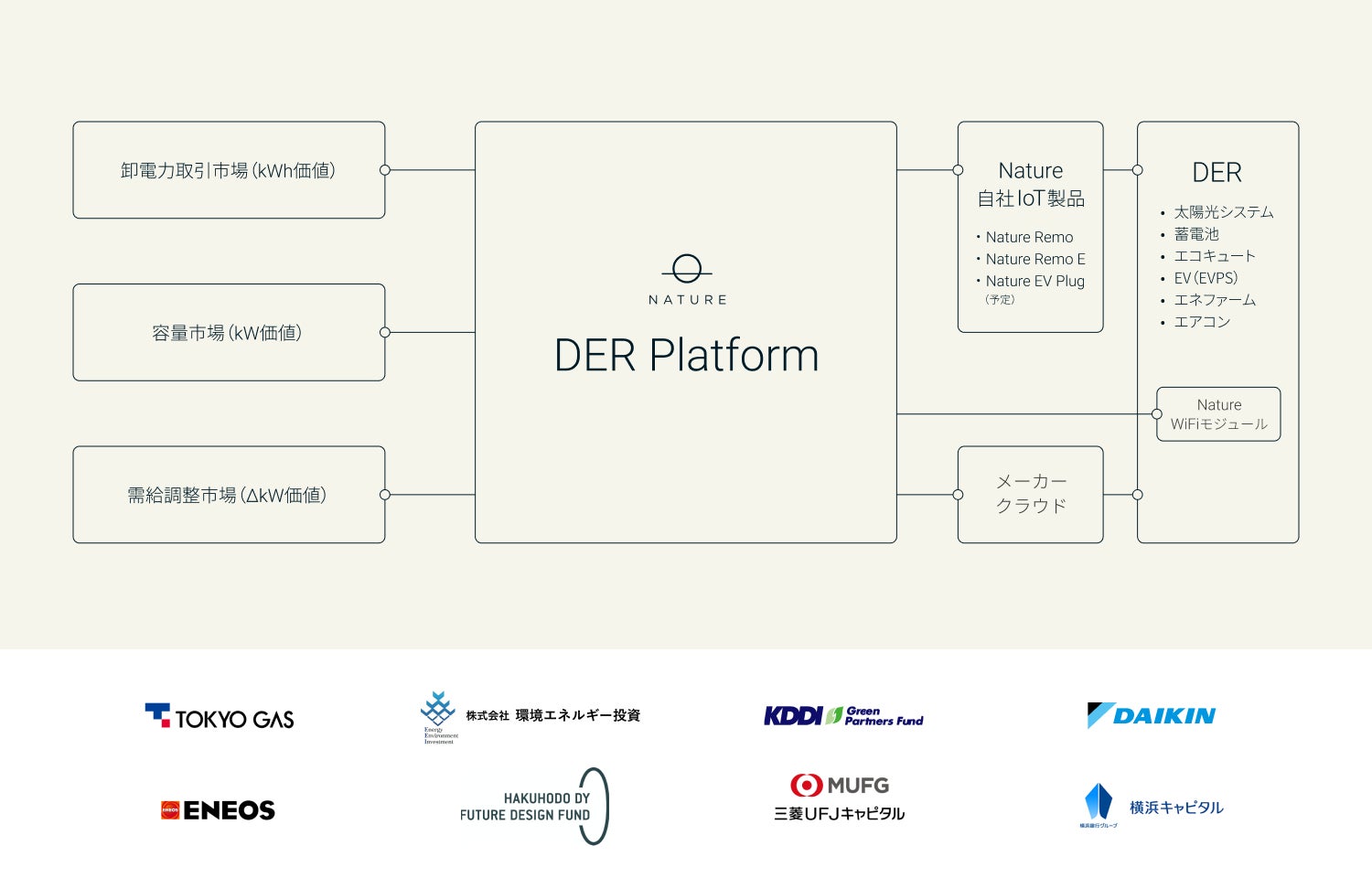 それらを実現するために、Natureでは、これまで培ってきた実績やノウハウを昇華させて、Natureのプロダクトやメーカークラウドを連携させ、DER(Distributed Energy Resources:分散型エネルギーリソース)を最適制御するエネルギーマネジメントプラットフォーム「Nature DER Platform」の構築を進めております。新たな市場の開拓と更なる企業としての成長を続けるため、Natureの考えに賛同いただいたパートナー企業・投資家の皆さまより、約10.2億円の資金調達を行いました。また、今回ご出資いただいたパートナー企業の皆さまとは、共同事業の展開も協議しています。