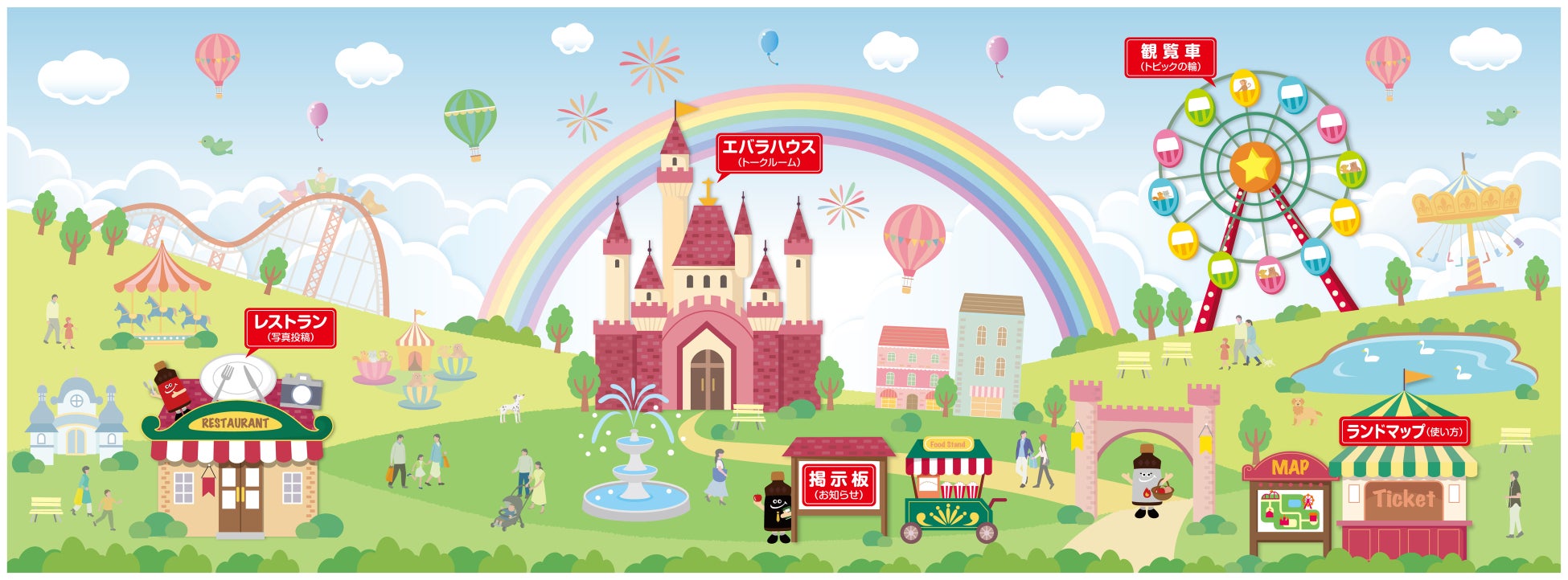 「エバラランド」では、アトラクションに見立てた5つの機能をご用意しました。お気に入りの商品やレシピなどをシェアできる「レストラン(写真投稿)」や、お客さま同士が自由に交流できる「エバラハウス(トークルーム)」。ほかにも、趣味などトピックごとに交流する「観覧車(トピックの輪)」やお知らせを掲示する「掲示板(お知らせ)」、「エバラランド」の遊び方を紹介する「ランドマップ(使い方)」をお楽しみいただけます。