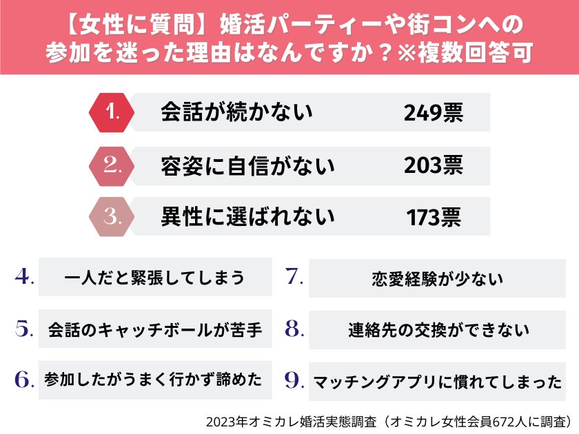 上位に選ばれたのは、婚活パーティーや街コンを象徴するこんな理由です。