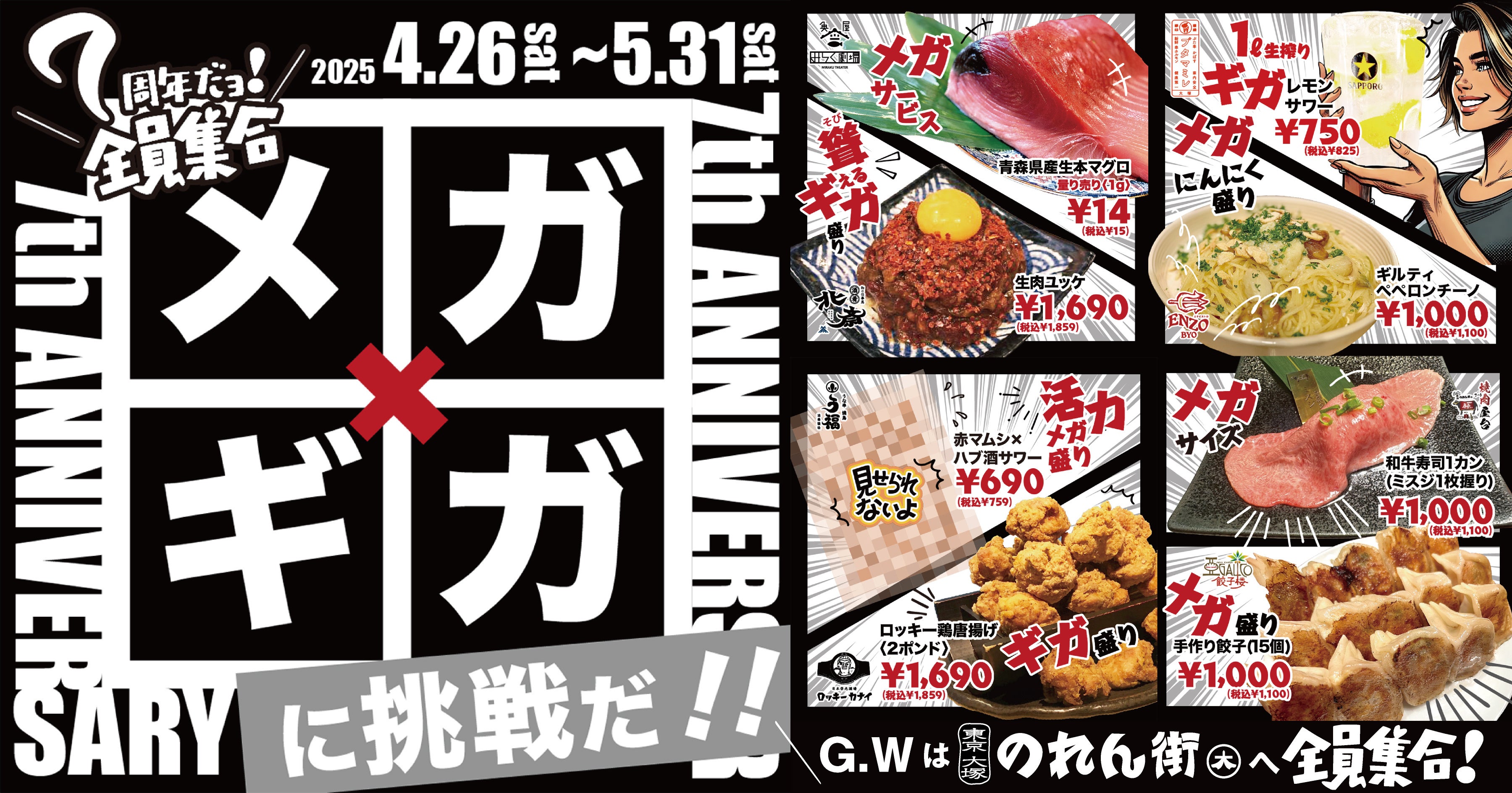 東京大塚のれん街は5月9日に7周年を迎えます。つきましては4月26日~5月31日までの間「メガ・ギア盛り祭!」を企画して皆様をお迎えします。