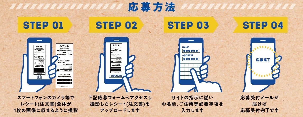 対象となるレシートの情報(購入日、購入製品、店舗、購入金額)がわかるように撮影し、画像をWEB応募フォームから送信