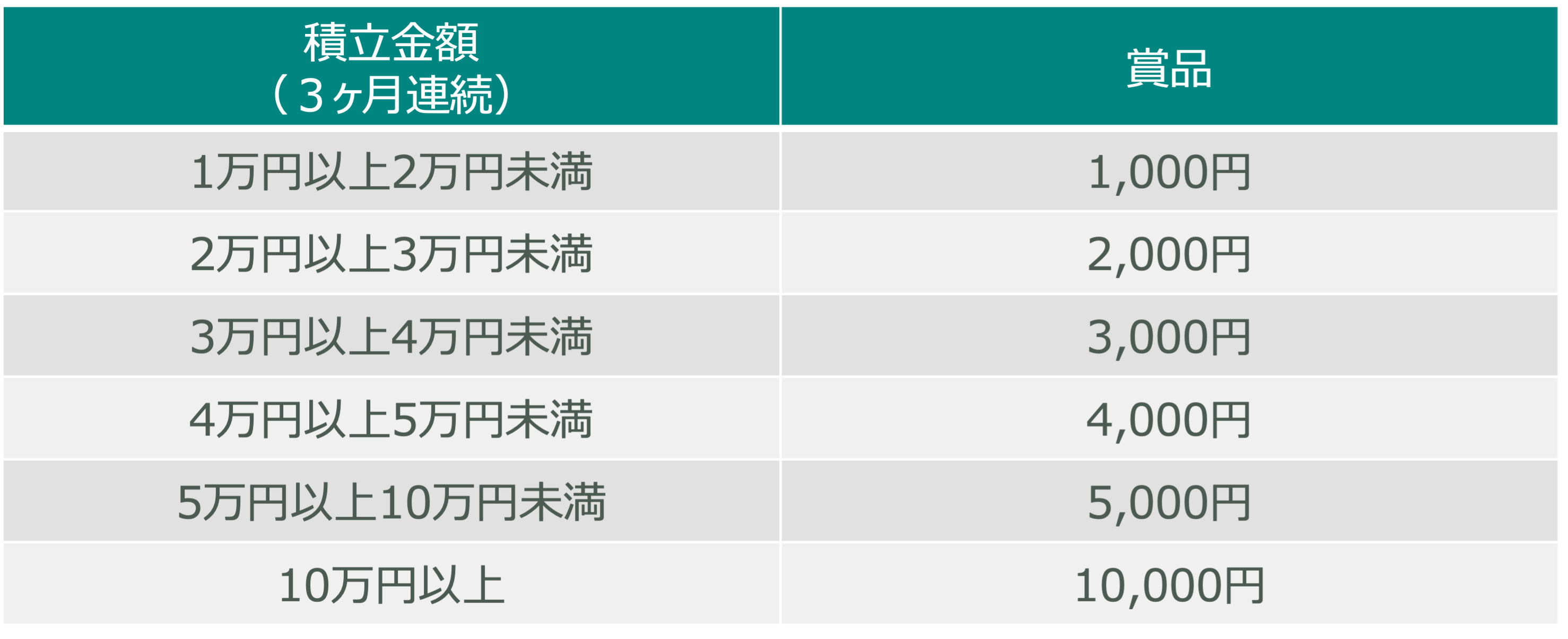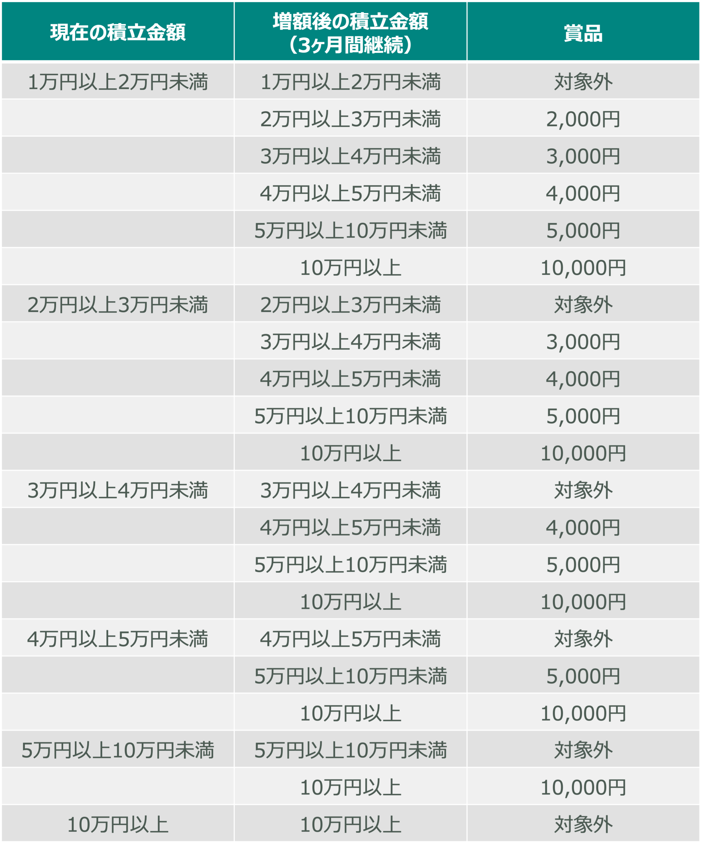 キャンペーン期間中に積立金額を賞品に定める一定金額以上増額し、2022年5月9日から3ヶ月間継続して買い付けを行なった方