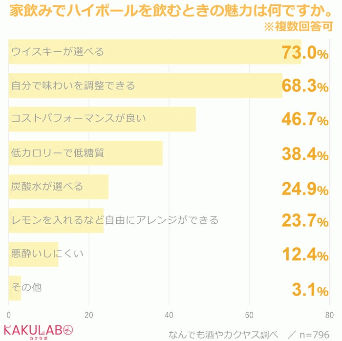 「お店で飲むよりも濃くして飲む」「週末は濃いハイボール」「一杯目は薄く、徐々にアルコール度を上げる」「炭酸水のほか、コーラやジンジャーエールも準備して気分に合わせて変えて飲む」など、アルコールの濃度や割材を自由に調整できることを挙げる意見が多数みられました。