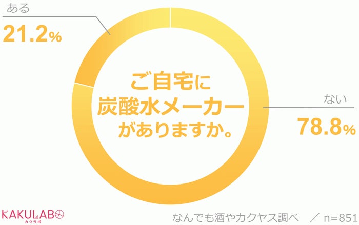 そこで、自宅に炭酸水メーカーがあるかを聞いてみたところ、「ある」と回答したのは全体の約2割で、その大半が「ソーダストリーム」という機種でした。「ソーダストリームの唯一の欠点、ガスシリンダーの購入もカクヤスから配達してもらえるようになり、ソーダストリームに変更。ペットボトルの廃棄量が激減しました」という声も。