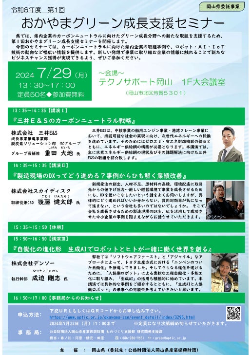 株式会社スカイディスク(本社:福岡県福岡市中央区、代表取締役CEO:内村 安里、以下「スカイディスク」)は、岡山県内の企業様向けに、岡山県/公益財団法人岡山産業振興財団が主催する「おかやまグリーン成長支援セミナー」に登壇します。スカイディスクは「製造現場のDXってどう進める?事例からひも解く業績改善」をテーマに、業績改善につなげるための経営・組織のあり方や、DXの成功事例やGXへの示唆について講演します。