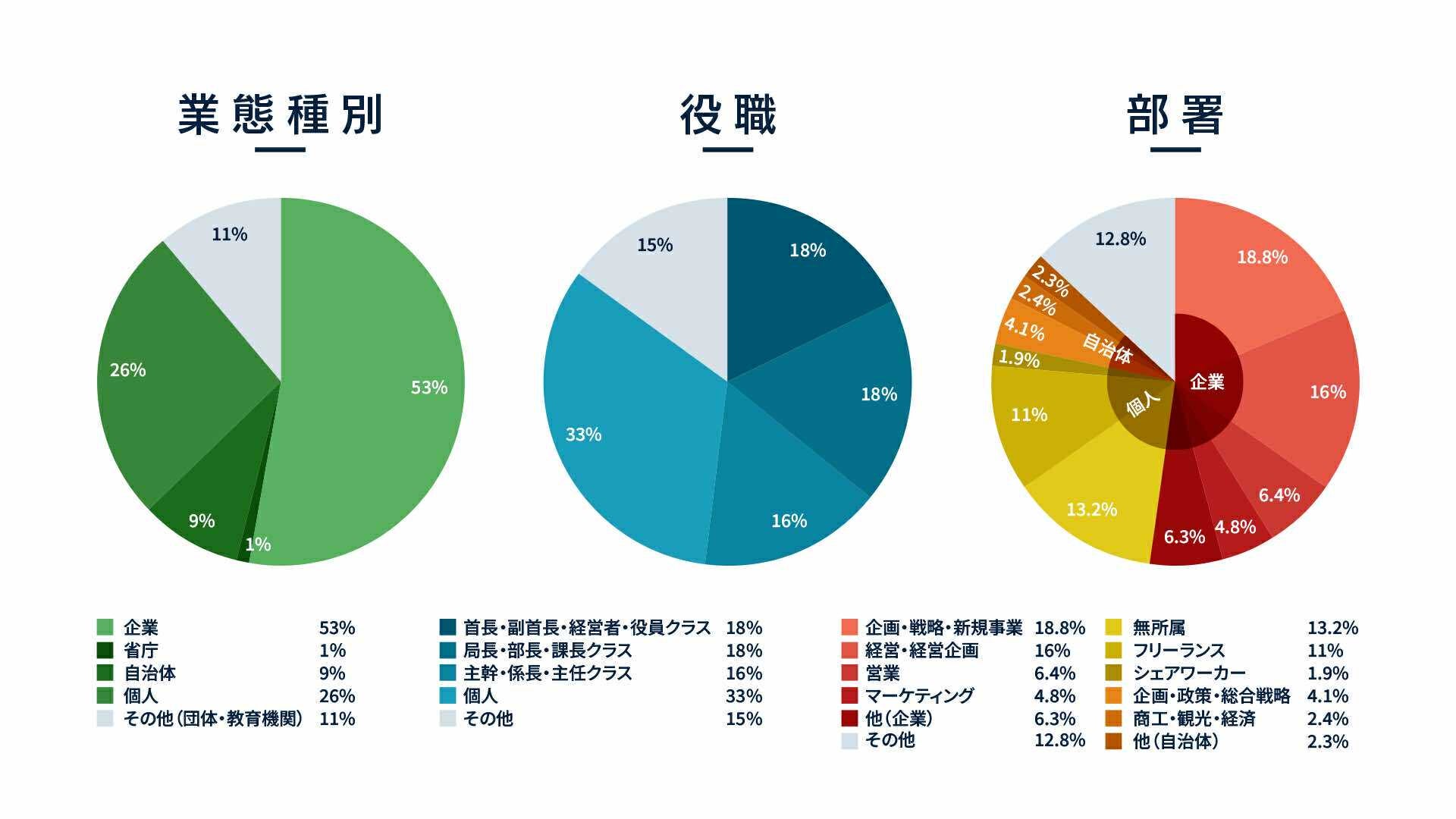 過去の参加者のうち、企業所属者が全体の約53% を占めており、民間企業を中心に、省庁・自治体・教育機関など公的機関からの参加も見られます。