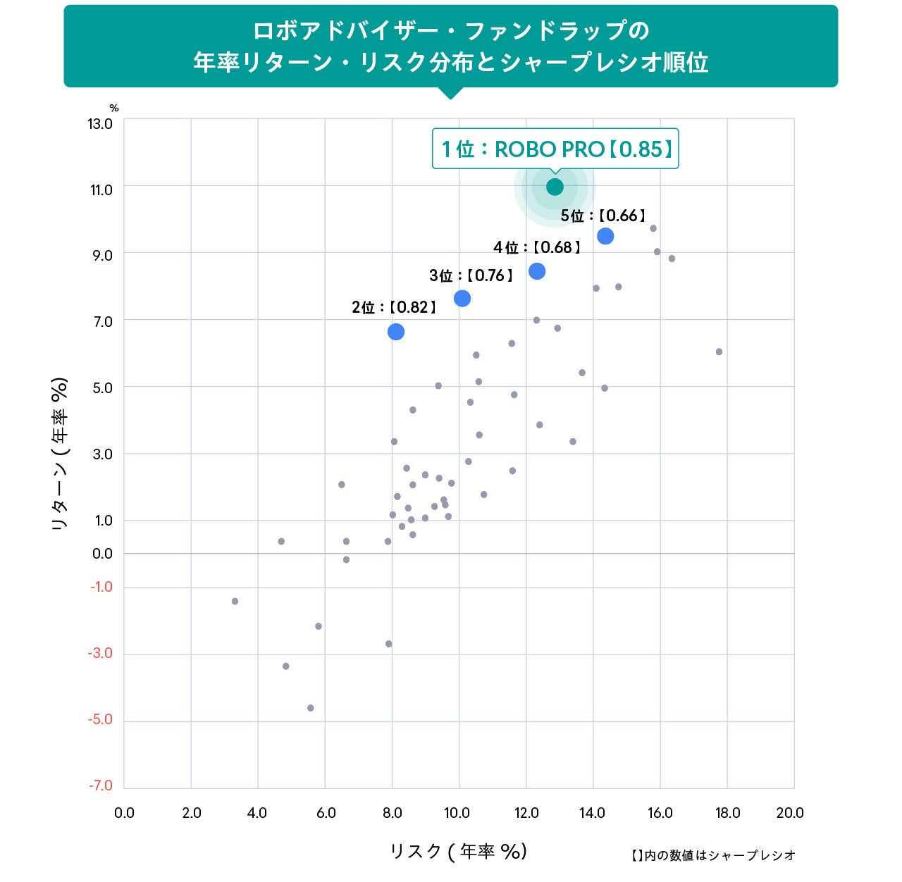 ROBO PROと各社ロボアドバイザー、各社ファンドラップ(SMAを含む)の過去3年の年率リターンと年率リスクを比較し(※1,2)、リスクに対するリターンの効率を示すシャープレシオの上位5位までを示しました。