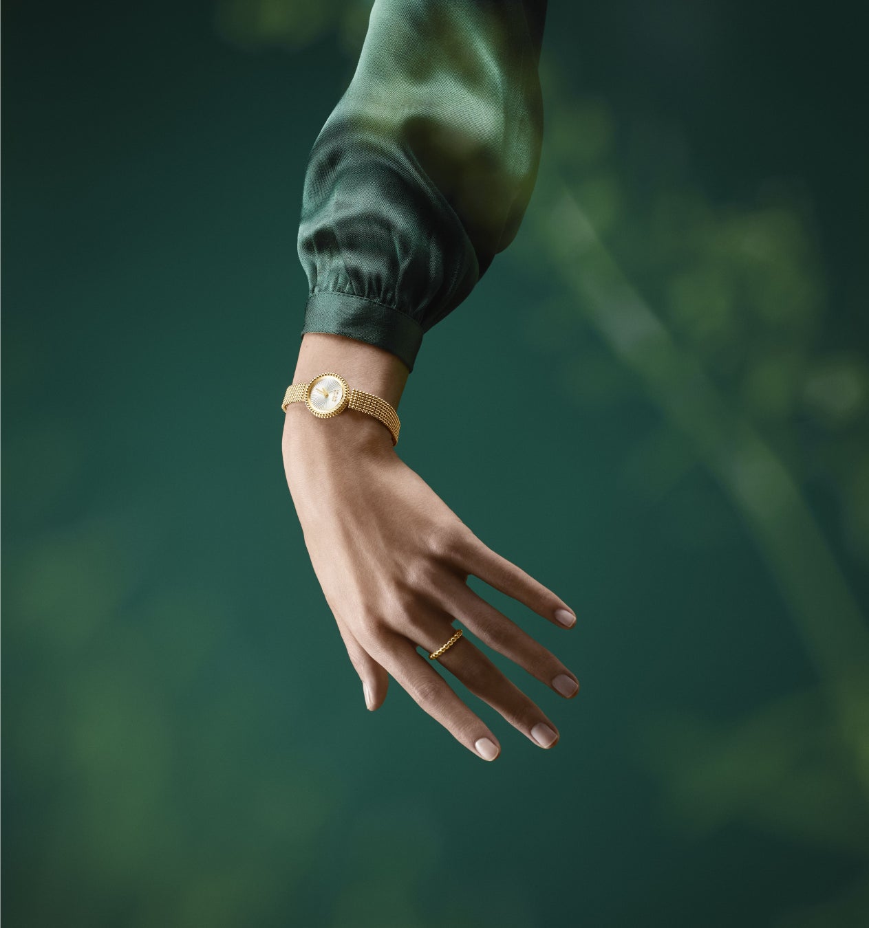 5点の新作のうち4点のケース径が23mm、1点が30mmとなっています。各モデルには、交換可能なアリゲーターストラップが付属するほか、コレクションの中から2本目を自由にお選びいただけます。またジュエリーウォッチの精神を受け継ぐ作品として、ゴールドビーズを連結したジュエリーブレスレットのモデルが用意されています。こちらのペルレ ウォッチは、ケースの周囲にあしらわれたゴールドビーズと響き合うブレスレットが、まるで第二の皮膚のごとくしなやかに手首の動きにフィットするため、ごく快適な装着感です。またストラップは、身に着ける方の気分に合わせて簡単に交換することができます。