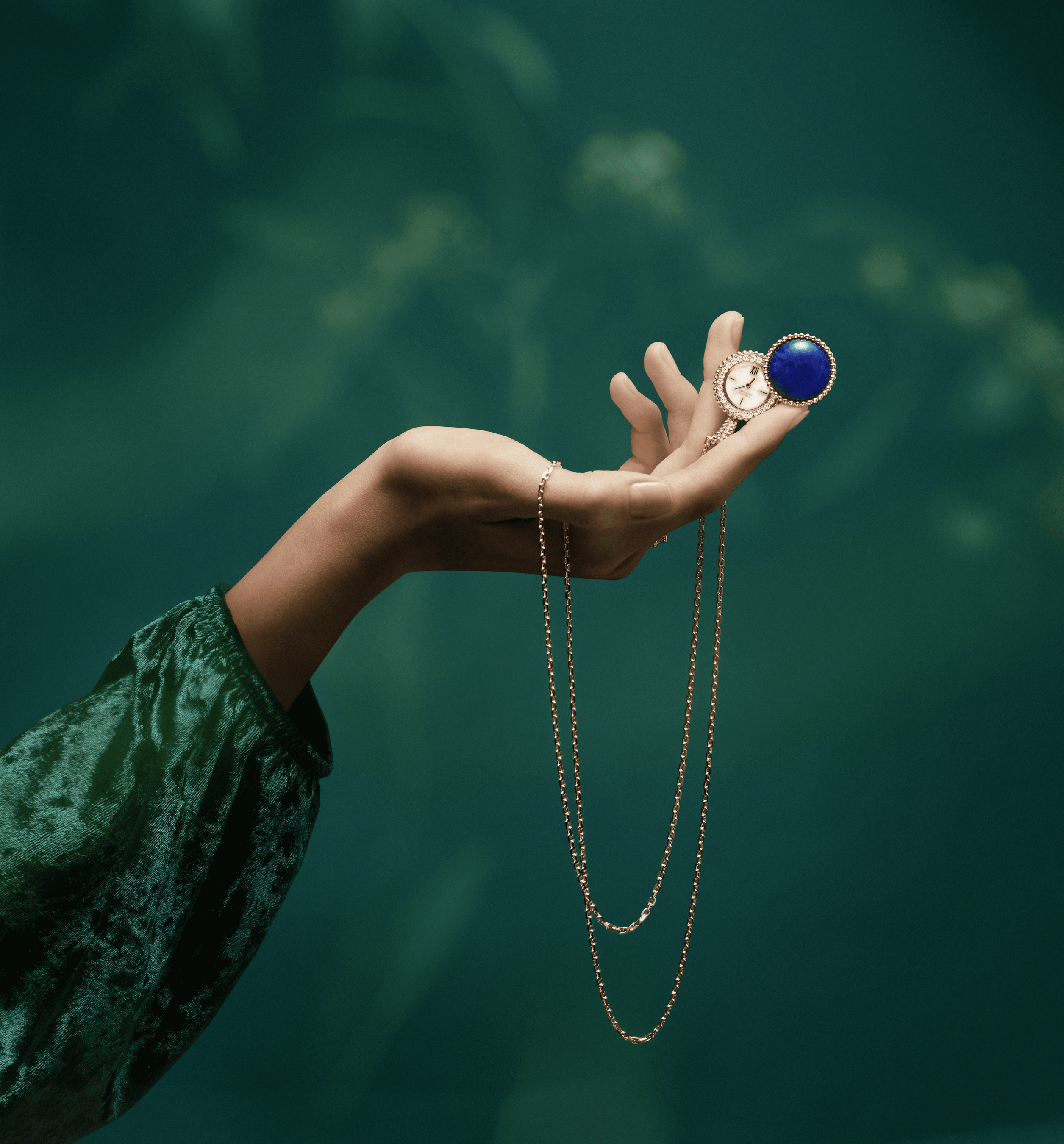 ジュエリーの輝きを放つ6点のシークレットウォッチでは、ゴールドビーズが貴石やオーナメンタルストーンの色調を引き立てながら、再び魅惑的なバレエを繰り広げます。17世紀のヨーロッパに登場した懐中時計から想を得たこれらの作品は、曲線を描くカラフルなペンダント型をしています。ロングネックレスのペンダントとして身に着けることができ、装いを彩る本格的なジュエリーとなります。宝石をちりばめたモチーフをそっと回転させると文字盤が現れ、さりげなく時間を確認することができます。